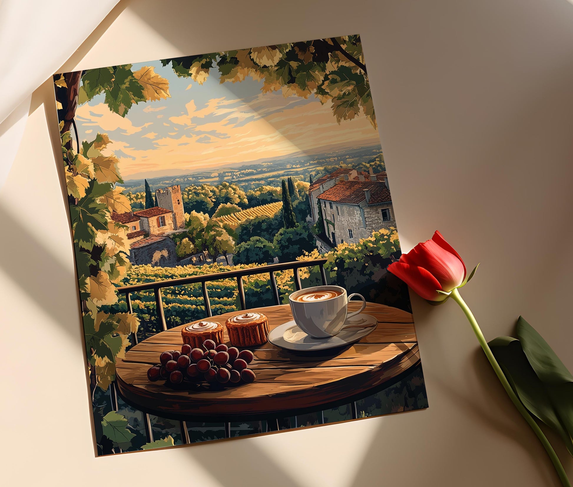 Découvrez cette magnifique affiche qui capture l'essence d'un petit-déjeuner français, avec des canelés, un cappuccino et des raisins disposés sur une table en bois. L’illustration évoque une atmosphère apaisante, où la lumière dorée met en valeur les vignobles et châteaux de Bordeaux, apportant une touche de culture à votre décoration murale. Ce poster mural, idéal pour tout amateur d'art mural, insufflera une ambiance chaleureuse et élégante à votre intérieur.
