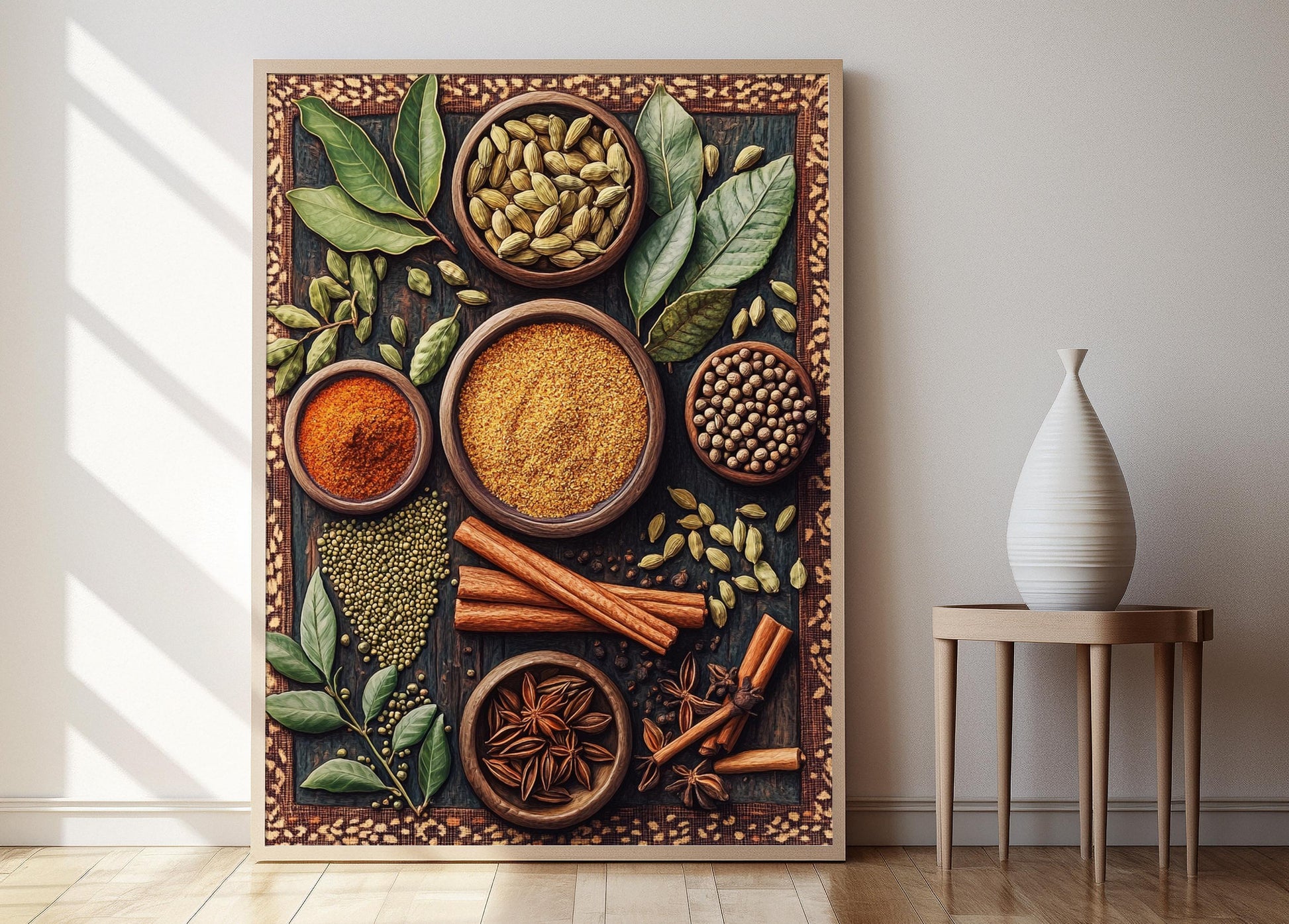 Découvrez cette magnifique affiche qui célèbre les épices aromatiques des cuisines sri-lankaises, joliment disposées sur un tapis tissé à la main aux motifs délicats. Cette illustration chaleureuse et vibrante apporte une richesse culturelle à votre décoration murale, créant ainsi une ambiance chaleureuse et accueillante dans votre espace. Parfaite en tant que poster mural, elle fera également sensation dans toute collection d'art mural.