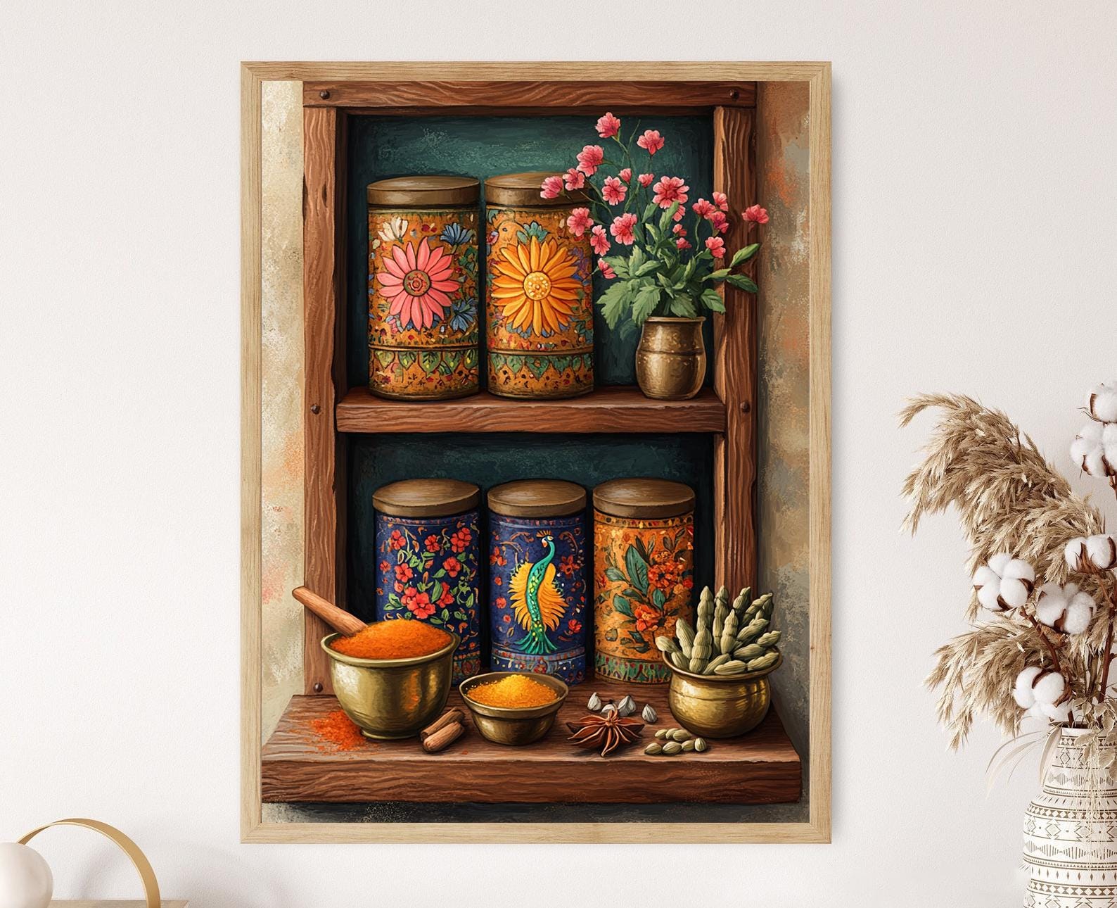 Découvrez cette affiche captivante qui met en avant des boîtes à épices indiennes peintes à la main, ornées de motifs Madhubani délicats. Avec son ambiance rustique de cuisine et ses élégants bols en laiton, ce poster mural évoque une célébration vibrante du patrimoine artistique indien, apportant une touche de chaleur et d'authenticité à votre décoration murale. Ajoutez cette illustration unique à votre art mural pour insuffler une atmosphère culturelle et inspirante dans votre intérieur.