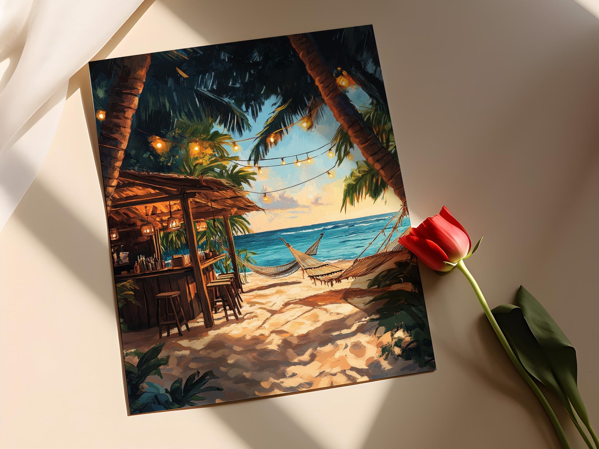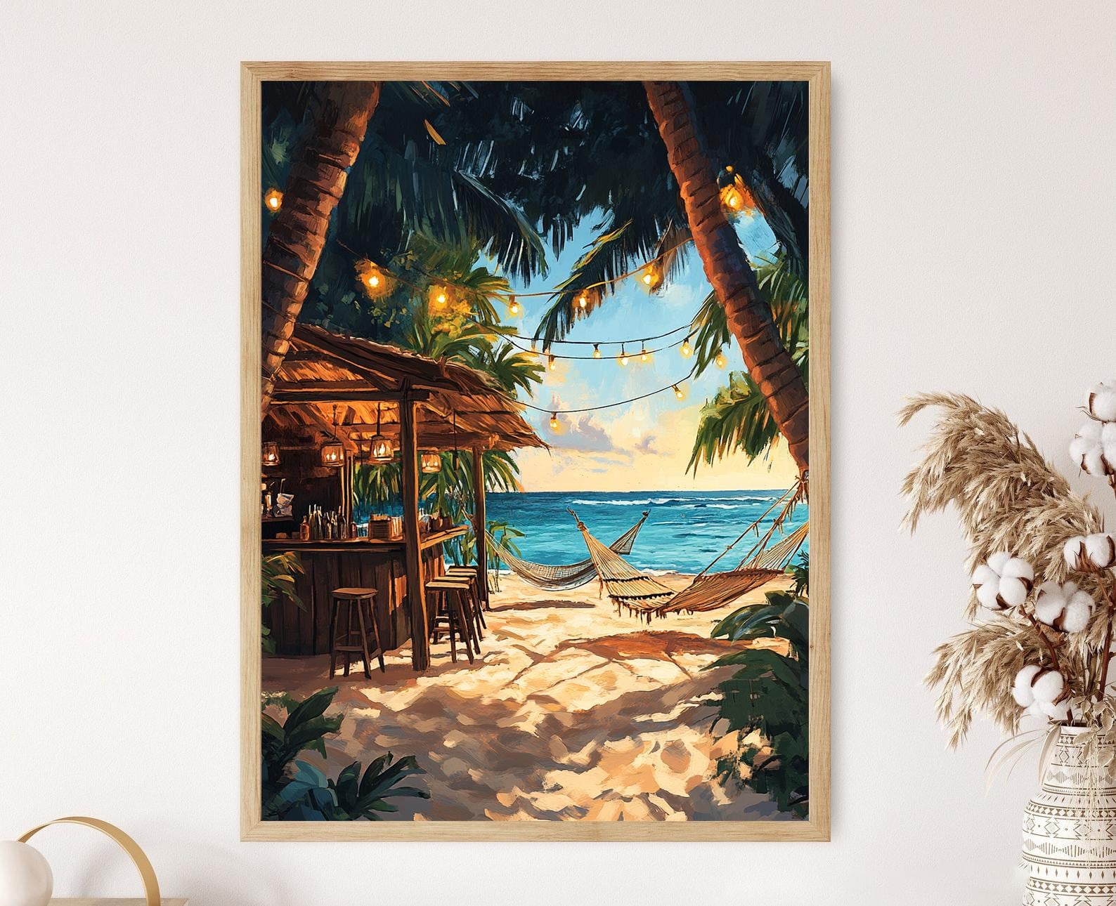 Plongez dans l'ambiance envoûtante des îles San Blas avec cette affiche captivante représentant un bar de plage vibrant. L'illustration, ornée de torches tiki et de hamacs tissés, évoque une atmosphère tropicale apaisante qui transformera votre espace. Ce poster mural est une véritable décoration murale qui apporte une touche d'évasion et de chaleur à votre art mural.