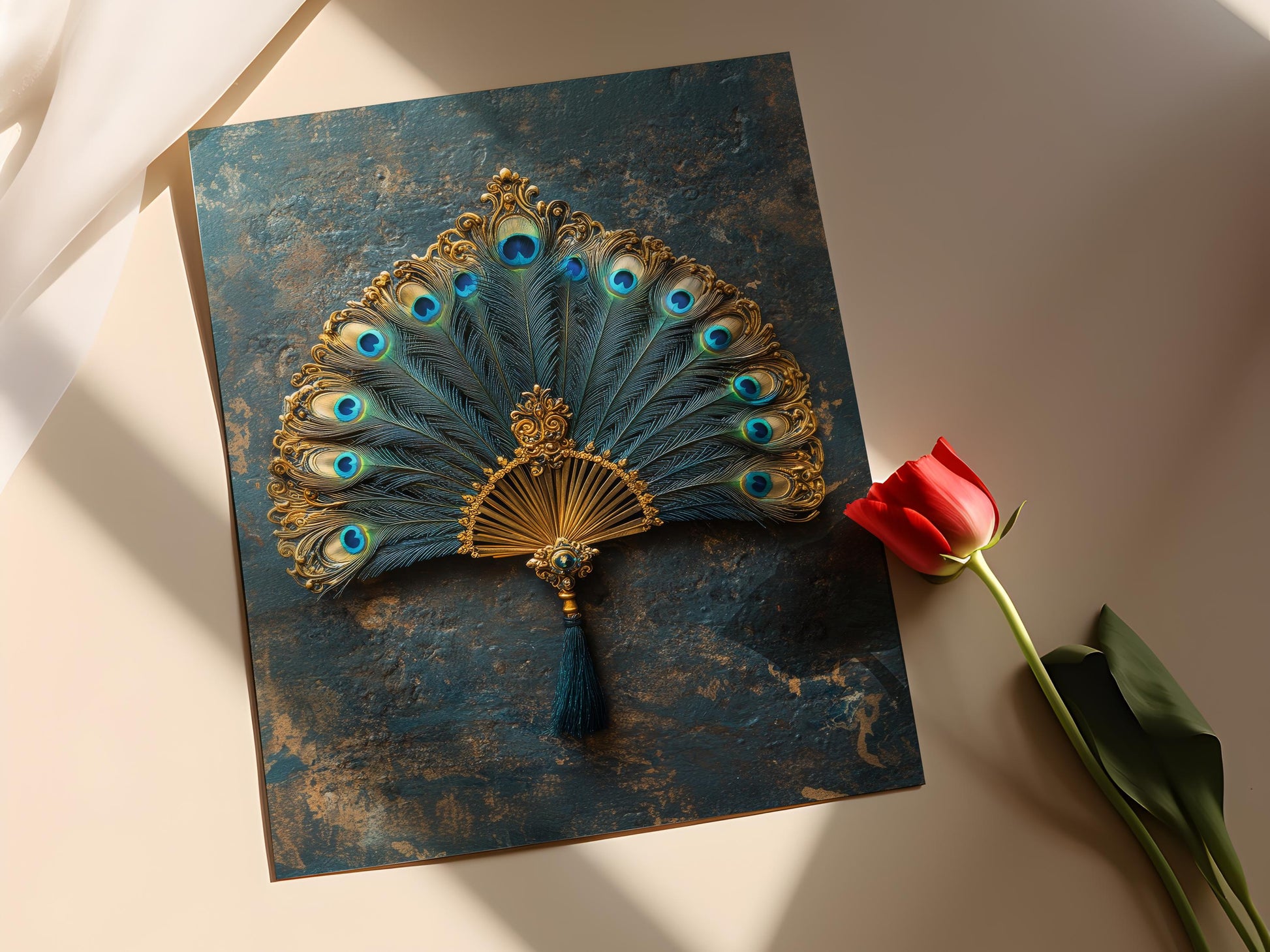 Découvrez notre affiche inspirante qui met en valeur un éventail en plumes de paon traditionnel indien, orné de délicates touches dorées. Cette illustration vibrante, riche en détails, évoque l'élégance et la beauté de l'art mural indien, apportant une touche colorée et chaleureuse à votre décoration murale. Ajoutez cette pièce unique à votre collection d'art mural pour transformer votre espace en un véritable havre de paix.