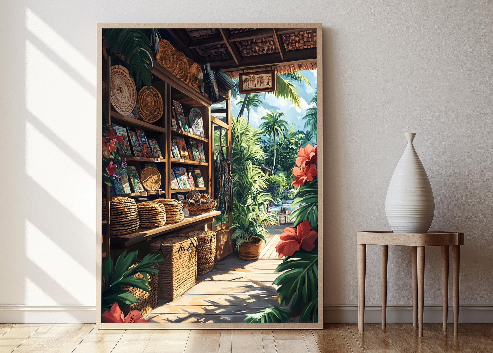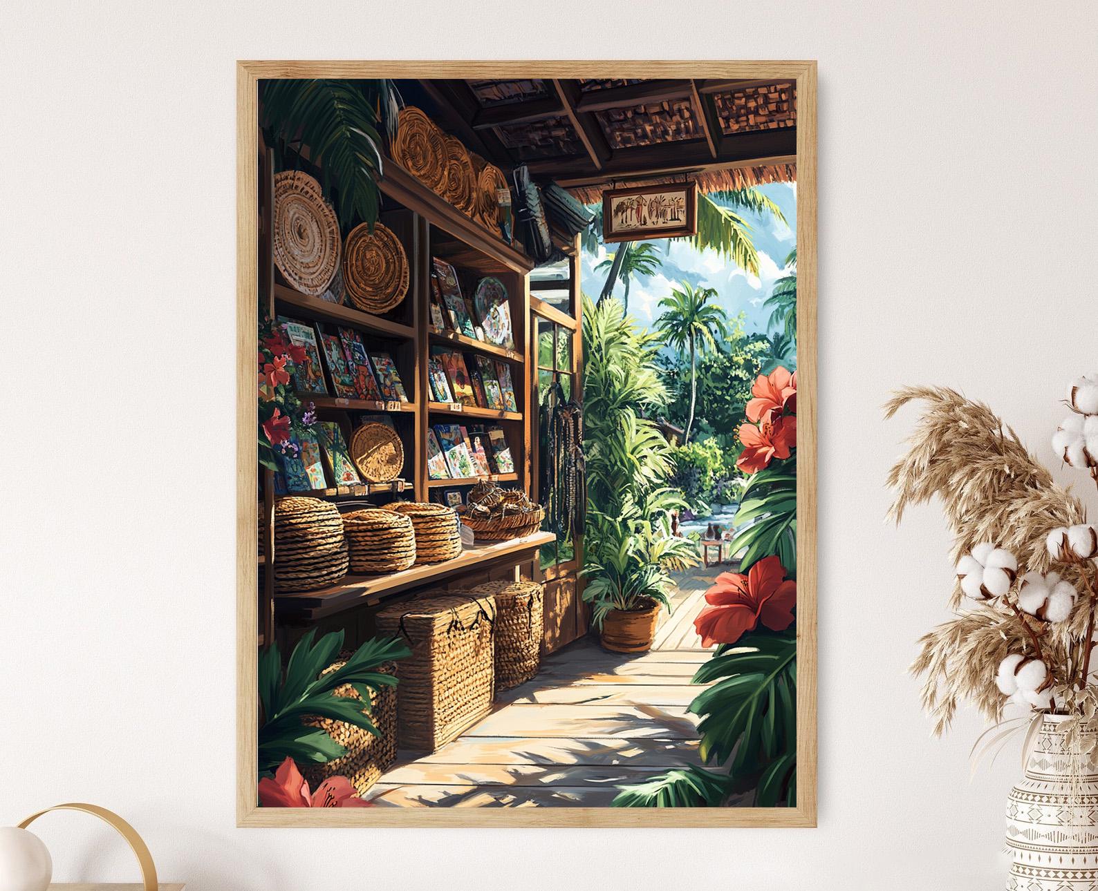 Découvrez cette magnifique affiche qui capture l'essence d'un magasin de cadeaux tahitien, rempli de paniers en pandanus tissés à la main, de chapeaux et de nattes, ornés de fleurs tropicales. Cette illustration vibrante évoque une ambiance chaleureuse et accueillante, parfaite pour une décoration murale inspirée des îles. Ajoutez une touche d'art mural unique à votre intérieur avec ce poster mural qui évoque le charme et l'exotisme de la culture polynésienne.