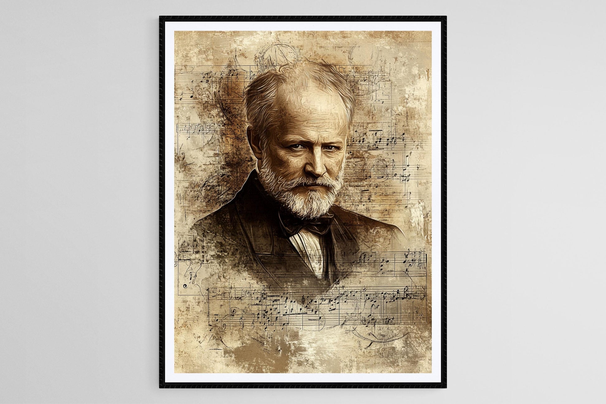 Découvrez cette magnifique affiche illustrant le portrait de Pyotr Ilyich Tchaikovsky, entouré d'un halo de notes de musique qui évoque la profondeur de son héritage musical. Cette décoration murale, alliant élégance et émotion, apporte une touche de sophistication à votre intérieur tout en célébrant le génie intemporel de cet illustre compositeur. Un véritable art mural qui saura inspirer et enchanter tous les passionnés de musique classique.