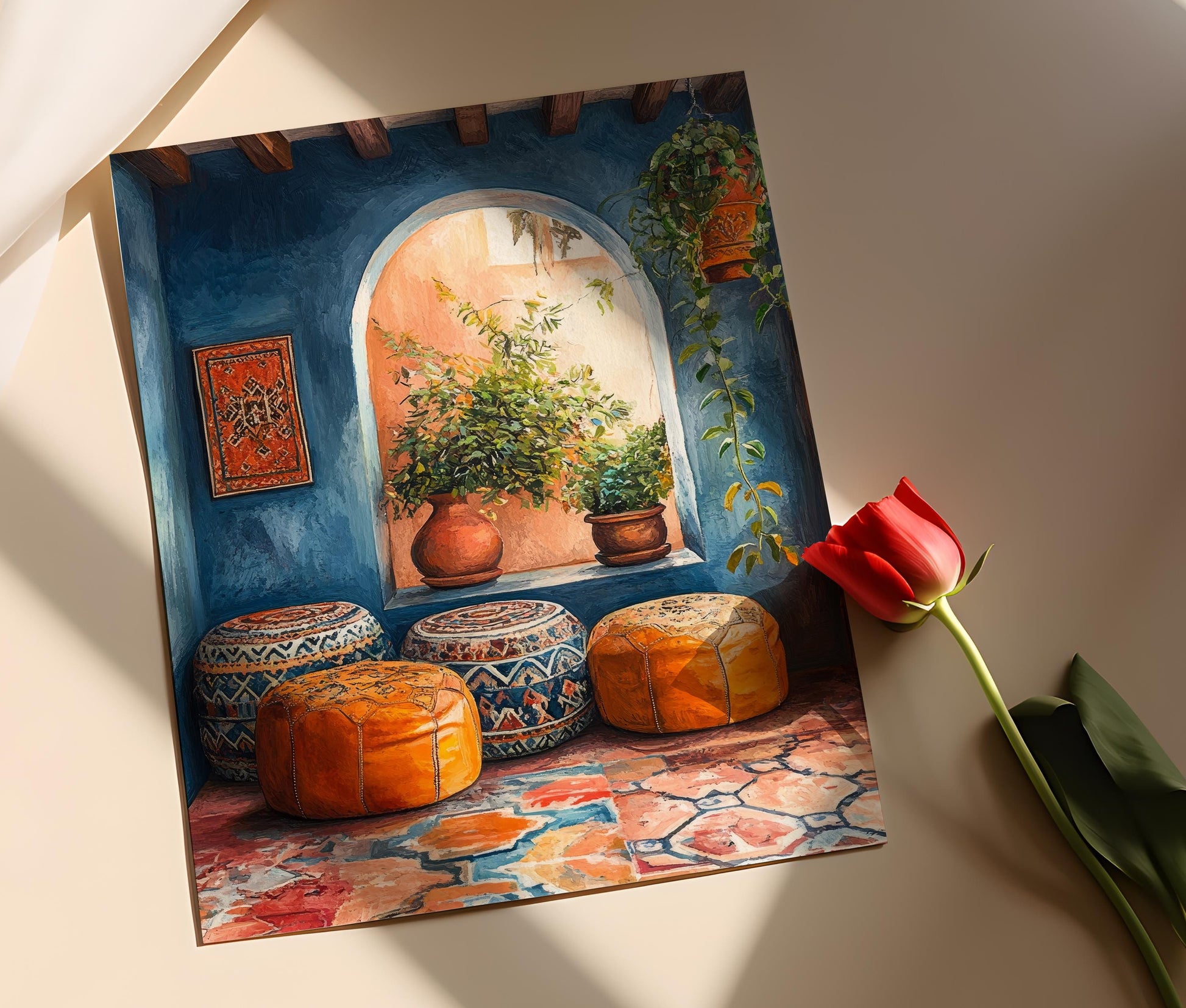Découvrez notre affiche captivante mettant en scène des poufs en cuir marocains ornés de motifs délicats, plongés dans une ambiance intérieure chaleureuse et accueillante. Cette illustration évoque l’authenticité et le savoir-faire artisanal du Maroc, apportant une touche d’élégance et d’exotisme à votre décoration murale. Idéale pour ceux qui souhaitent enrichir leur art mural d'une pièce à la fois esthétique et émotionnelle.
