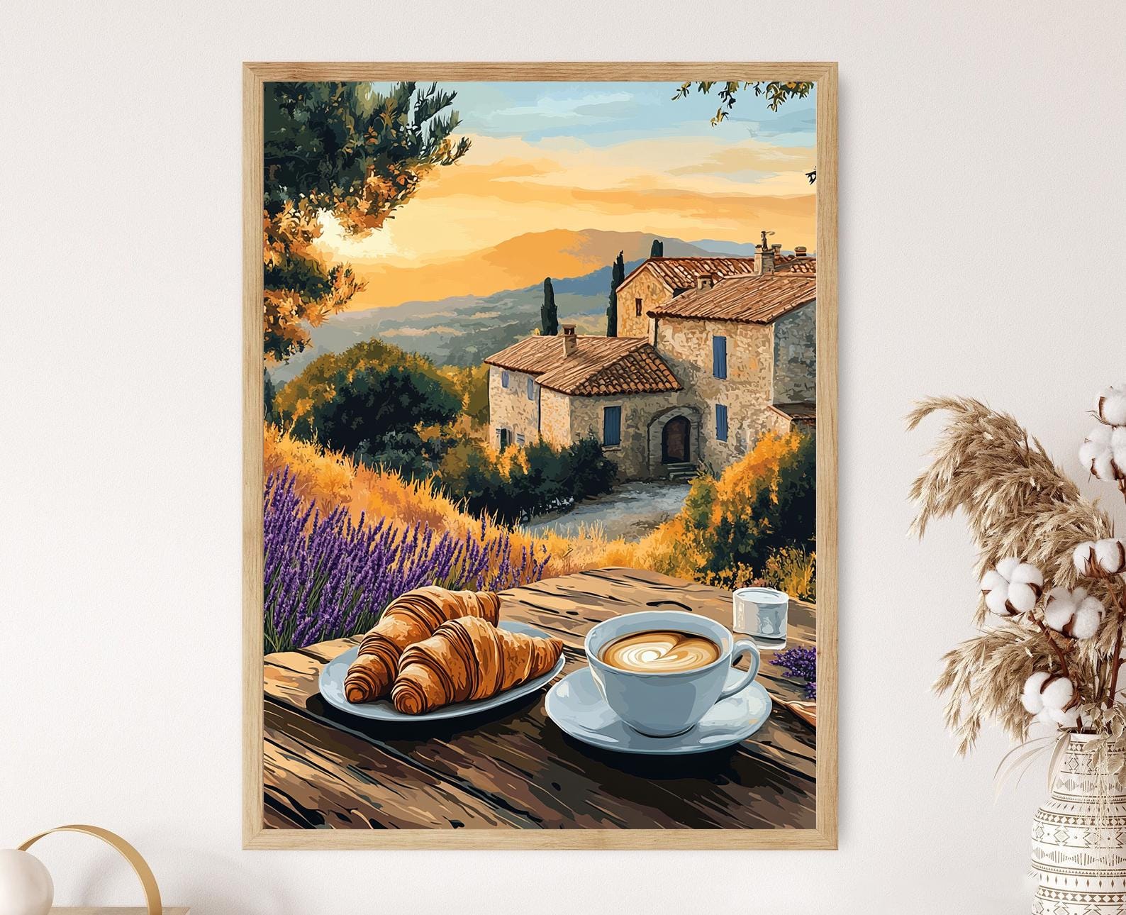 Découvrez cette affiche captivante qui évoque la douceur d'un petit-déjeuner français en Provence. Avec des croissants dorés, du miel de lavande et un café au lait, cette illustration dégage une atmosphère paisible, tandis que les champs de lavande et les maisons de pierre sous un doux lever de soleil ajoutent une touche de charme à votre décoration murale. Parfaite pour apporter une ambiance chaleureuse et romantique à votre art mural.