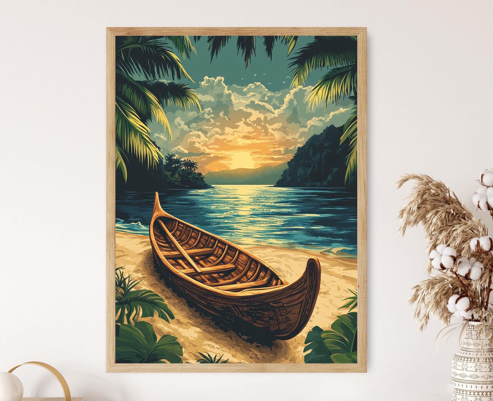 Découvrez notre affiche inspirante représentant une sculpture de proue de pirogue des Îles Salomon, ornée de motifs océaniques symboliques. Cette illustration vibrante évoque la richesse des traditions maritimes et du savoir-faire des peuples autochtones des Îles Salomon, faisant de ce poster mural une véritable œuvre d'art mural qui apportera une touche d'exotisme et d'authenticité à votre décoration murale. Plongez dans l'émotion et la culture à travers cette pièce unique, idéale pour enrichir votre intérieur.