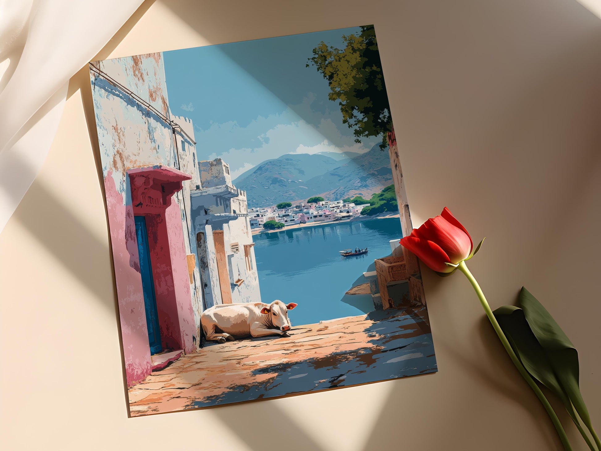 Découvrez cette magnifique affiche qui évoque la sérénité d'une ruelle paisible à Pushkar, Rajasthan. Cette illustration délicate, ornée de fresques vieillies et d'une vache reposante, invite à la contemplation et à la méditation, tout en apportant une touche d'art mural inspirant à votre décoration murale. Laissez-vous transporter par l'atmosphère spirituelle et chaleureuse de cette décoration, reflet de la beauté de la ville sacrée.