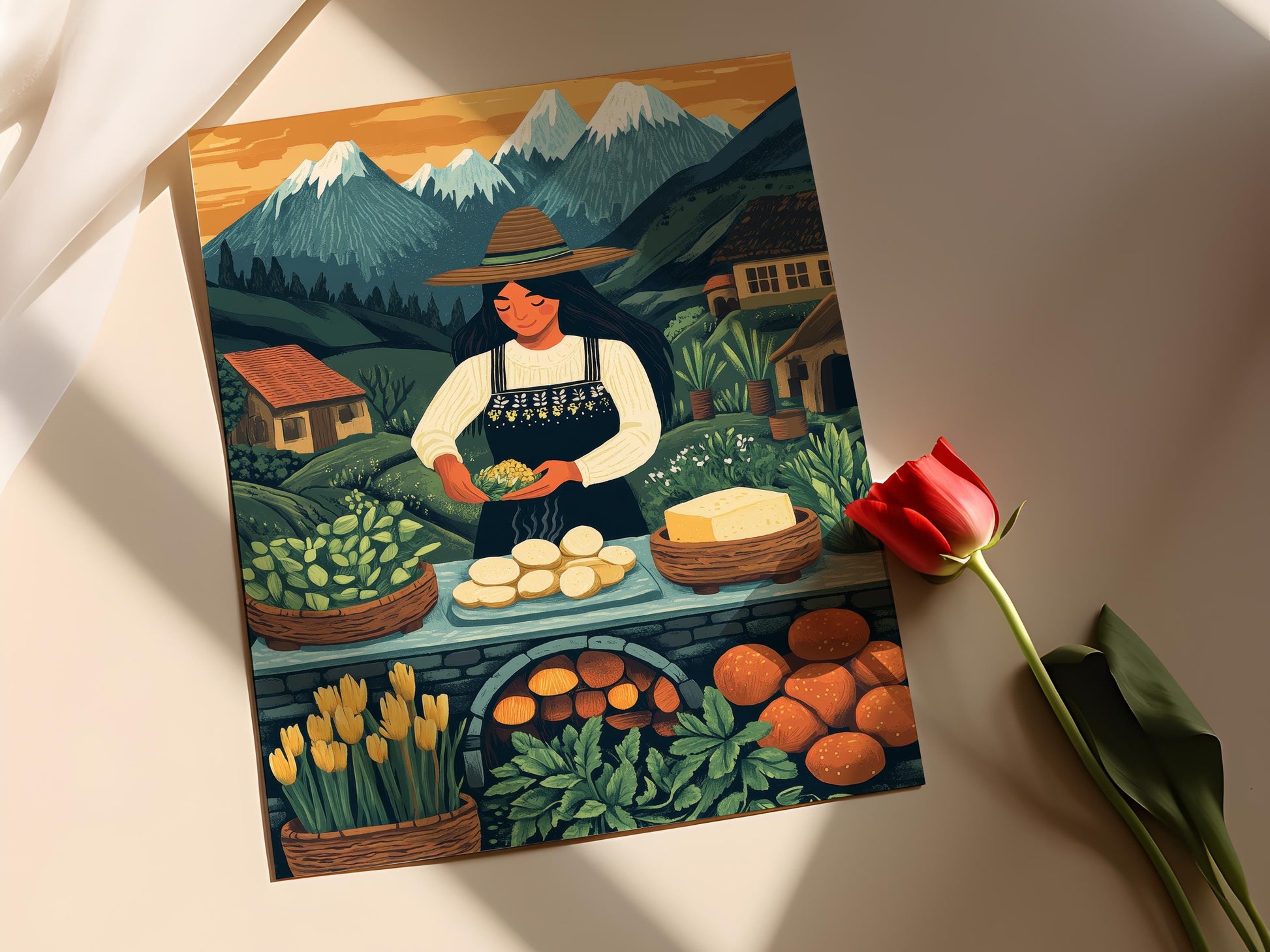 Découvrez cette affiche vibrante capturant l'essence de la culture équatorienne, où une femme andine en tenue traditionnelle prépare des llapingachos sur un four en pierre. Avec son illustration chaleureuse et détaillée, ce poster mural évoque des émotions de convivialité et de tradition, tout en apportant une touche unique à votre décoration murale. Idéal pour enrichir votre espace avec un art mural authentique et inspirant.