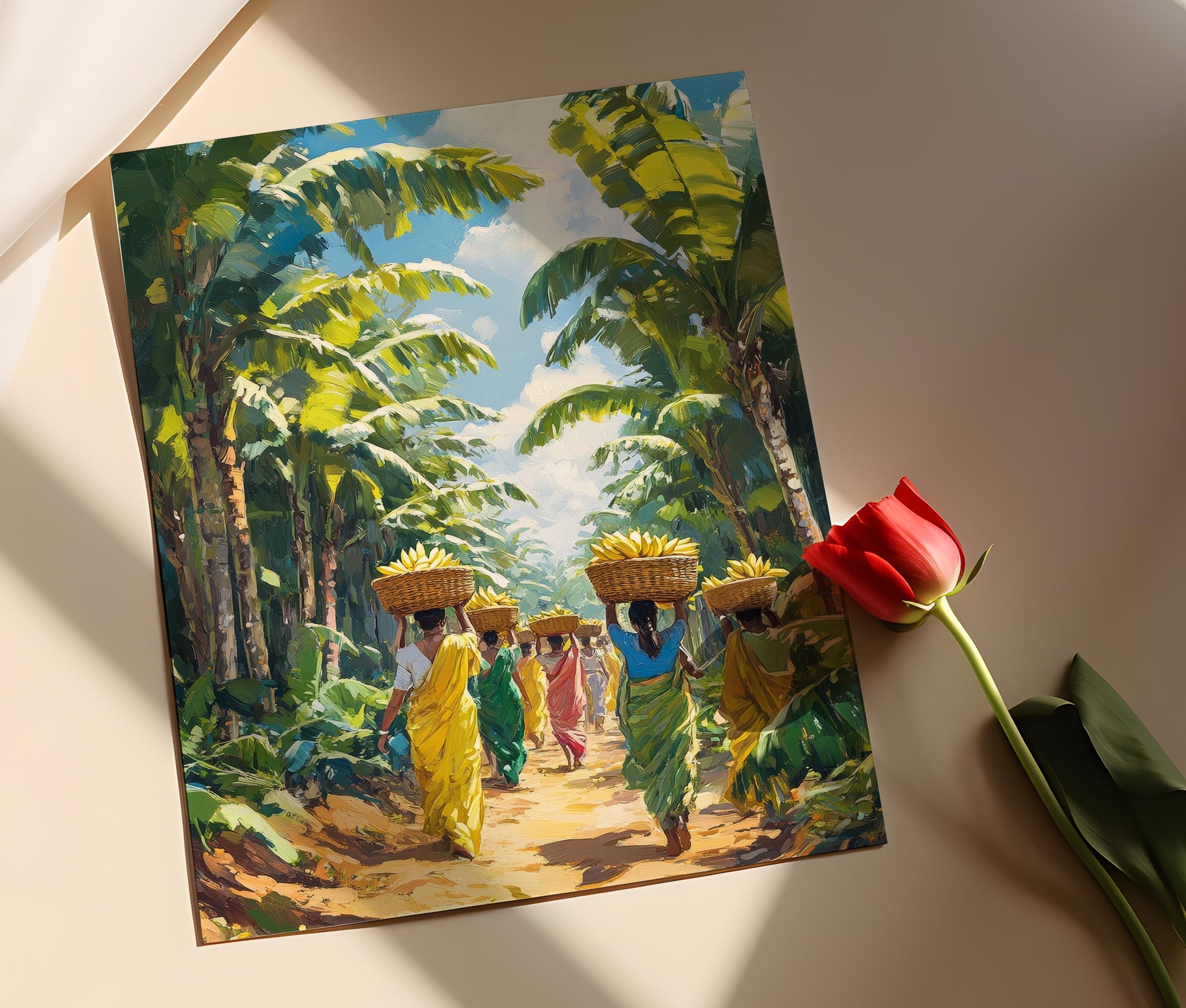 Découvrez notre affiche captivante qui illustre des agriculteurs indiens au Tamil Nadu, récoltant des bananes sous un ciel tropical. Cette illustration vibrant d'émotions dégage une atmosphère chaleureuse et authentique, mettant en lumière la beauté des traditions et la richesse des cultures agricoles. Idéale pour votre décoration murale, ce poster mural apportera une touche d'exotisme et d'élégance à votre art mural.