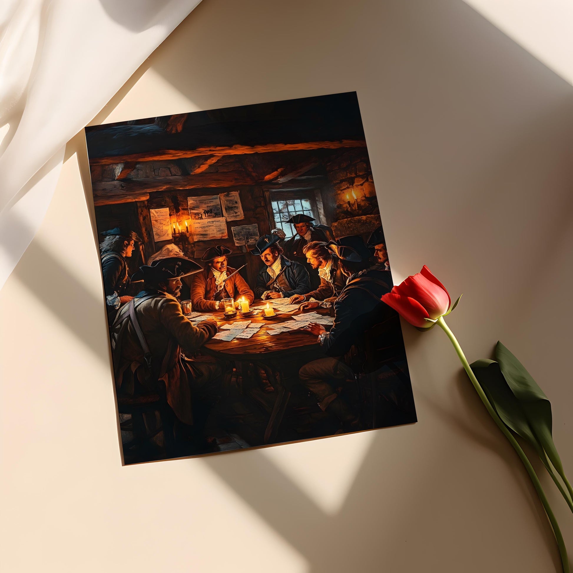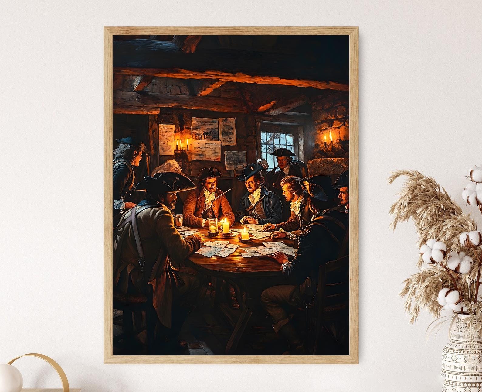 Plongez dans l'histoire avec cette affiche captivante illustrant les Fils de la Liberté réunis dans une taverne coloniale, entourés de lumière vacillante. Cette illustration, empreinte de force et de détermination, évoque l'esprit révolutionnaire à travers des détails soignés tels que des cartes et des mousquets, faisant de ce poster mural une pièce de décoration murale incontournable pour tout amateur d'art mural inspirant.