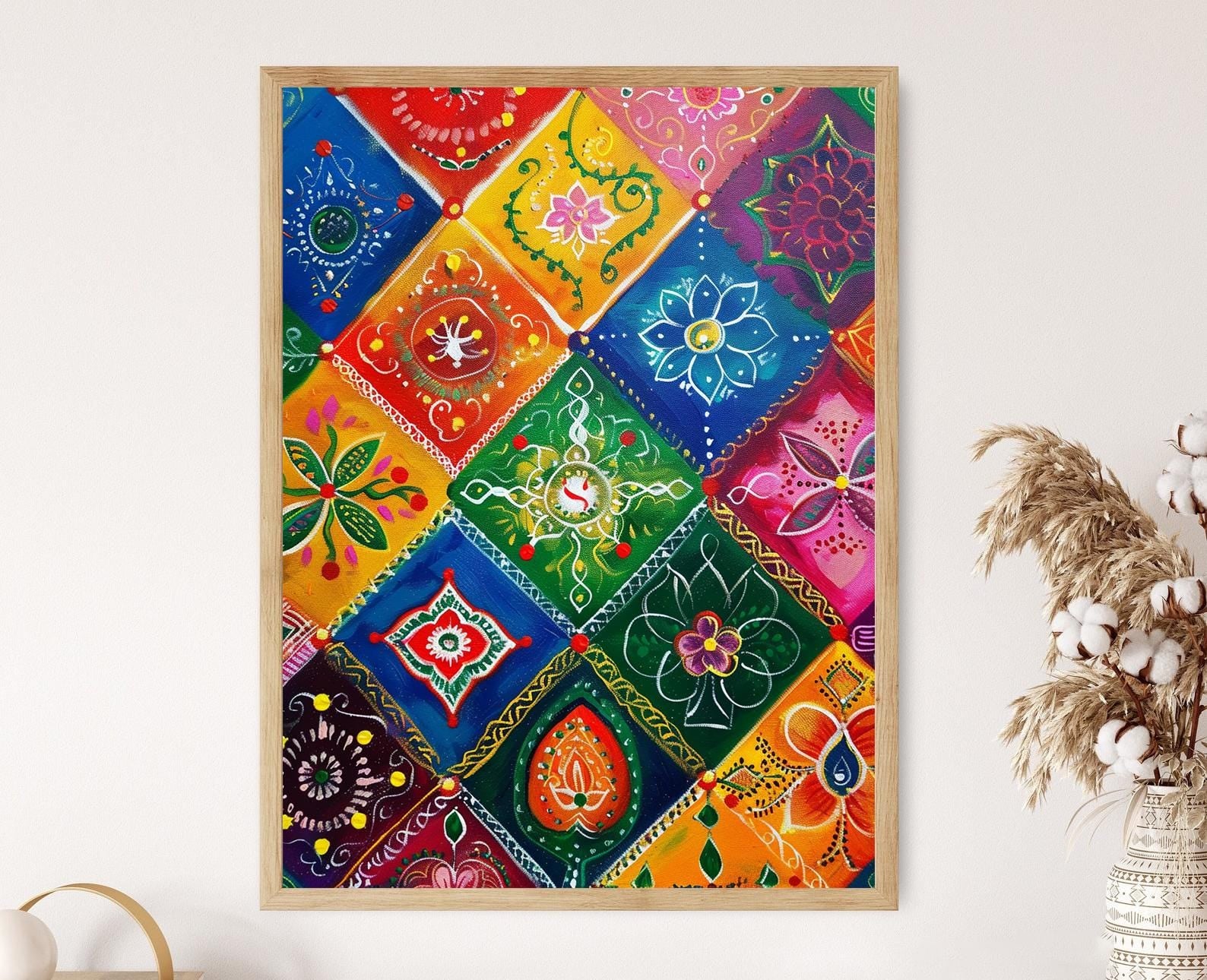 Plongez dans l'univers vibrant du Rangoli avec cette affiche artistique illustrant des motifs traditionnels indiens. Chaque détail, riche en couleurs, évoque une célébration de la culture, apportant une touche de chaleur et de joie à votre décoration murale. Ce poster mural, véritable œuvre d'art mural, saura transformer votre espace en une galerie d'illustrations enchanteresses et dynamiques.