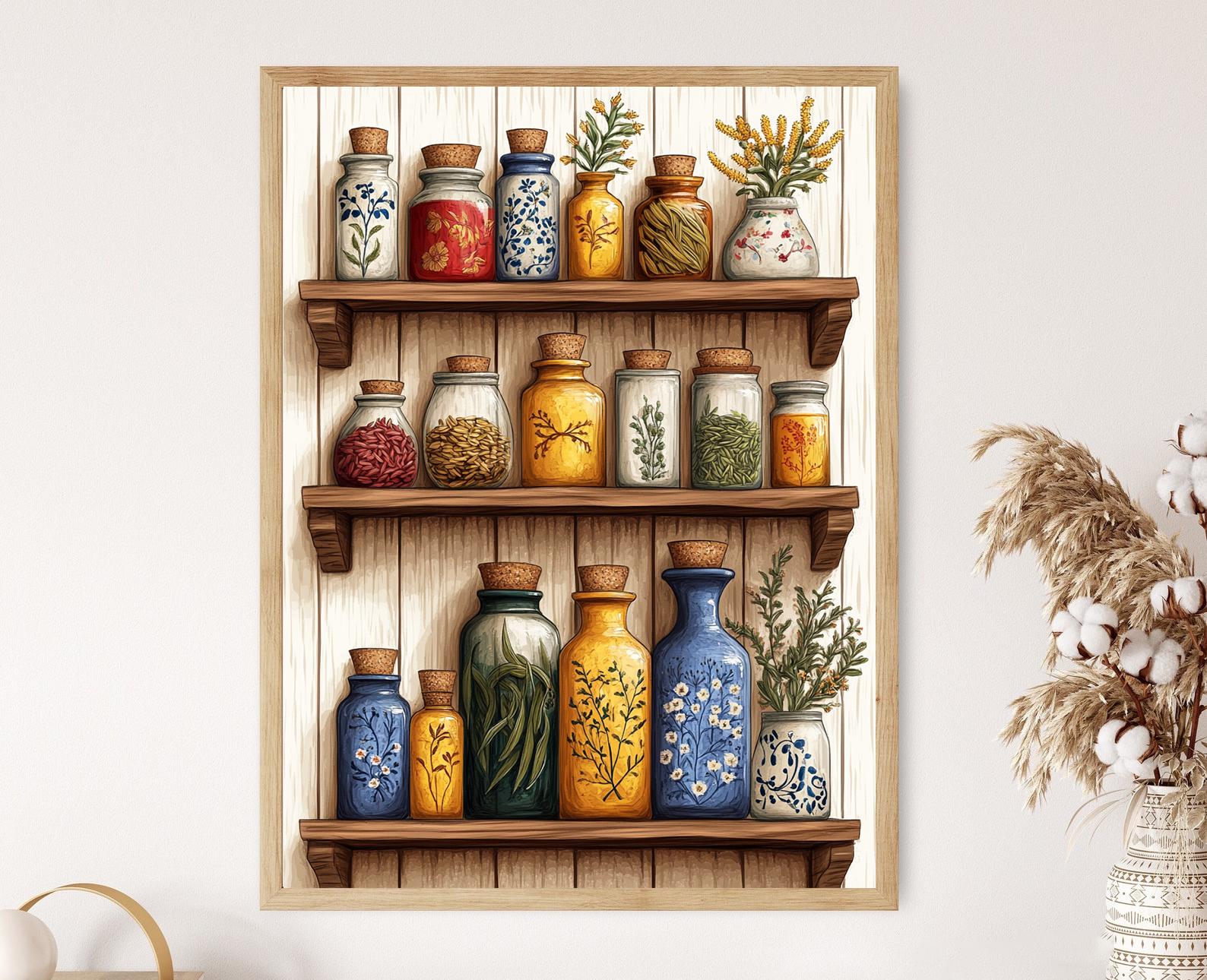 Plongez dans l'ambiance chaleureuse et authentique de cette affiche, qui met en avant une étagère rustique pakistanaise ornée de bocaux en céramique. Cette illustration riche en détails évoque un héritage de guérison à travers des graines aromatiques, tout en étant drapée de textiles traditionnels. Avec son style artisanal, ce poster mural apportera une touche de caractère et de charme à votre décoration murale, transformant votre espace en un véritable havre de paix.