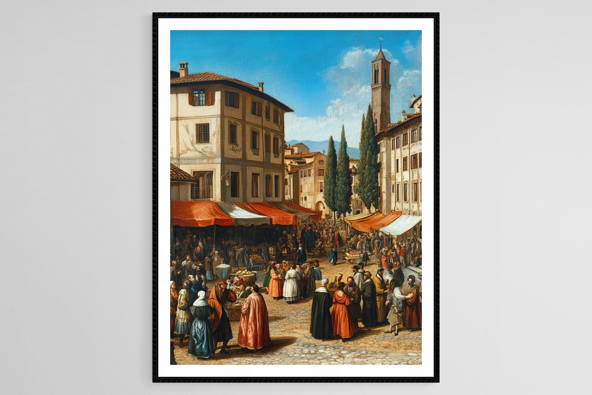 Découvrez cette magnifique affiche qui vous plonge au cœur de la Florence de la Renaissance. Avec son illustration riche en détails, ce poster mural évoque l'effervescence d'un marché animé peuplé d'artistes, de savants et de marchands, révélant l'esprit vibrant d'une époque de renouveau culturel. Parfaite pour ajouter une touche d'élégance et d'histoire à votre décoration murale, cette œuvre d'art mural saura séduire tous les passionnés d'art et d'histoire.