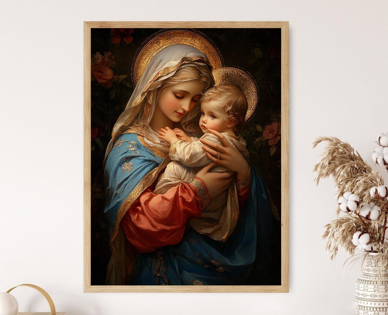 Découvrez cette magnifique affiche inspirée de la Renaissance, représentant la Vierge Marie tenant l'enfant Jésus, tous deux couronnés de halos dorés. Cette illustration éveille des émotions de dévotion chrétienne à travers ses couleurs riches et sa lumière divine douce, créant une ambiance de grâce et de sérénité idéale pour toute décoration murale. Ajoutez ce poster mural à votre collection d'art mural pour un impact visuel inoubliable.