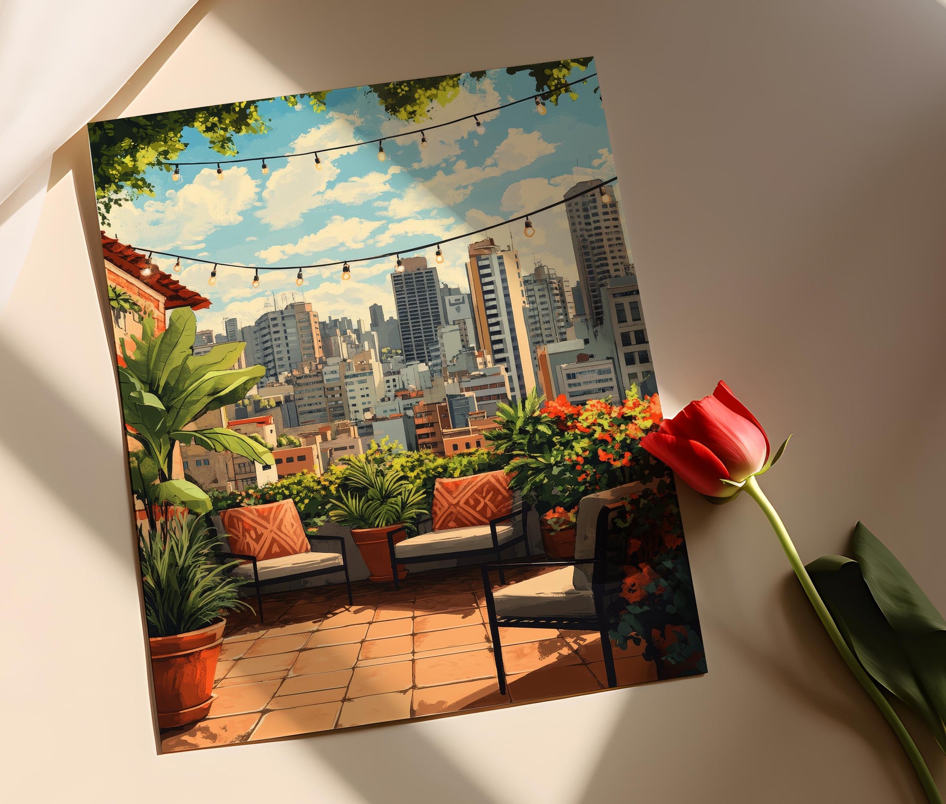 Découvrez cette magnifique affiche qui capture l'élégance urbaine d'un patio sur le toit de São Paulo, où le mobilier moderne se marie harmonieusement avec des plantes tropicales et des guirlandes lumineuses. Cette illustration vibrante offre une vue panoramique sur la skyline colorée, apportant une touche contemporaine et tropicale à votre décoration murale. Parfaite comme poster mural, elle insufflera une ambiance chaleureuse et accueillante à votre art mural.