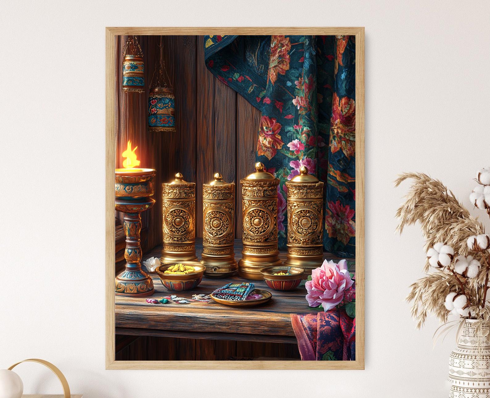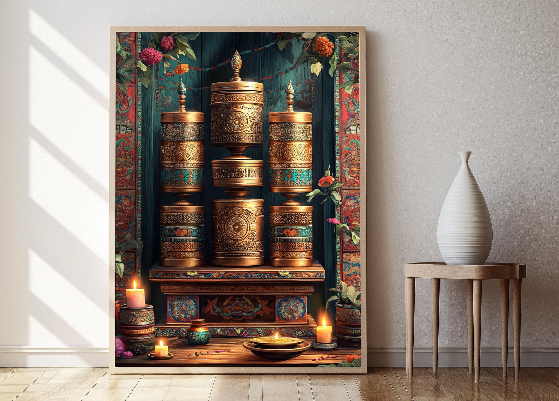 Découvrez cette affiche captivante qui met en valeur des moulins à prières tibétains en cuivre, délicatement gravés de textes sacrés. La composition harmonieuse, agrémentée de lampes en beurre de yak et de textiles tissés, évoque une atmosphère spirituelle apaisante, parfaite pour toute décoration murale. Ce poster mural est une véritable illustration de sérénité et d'héritage culturel, idéale pour enrichir votre art mural.