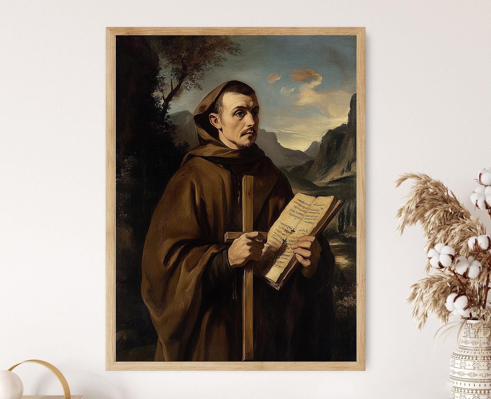 Découvrez cette affiche inspirante représentant Saint Jean de la Croix, le poète et mystique carmélite, tenant une croix et un rouleau sous un ciel apaisant. Avec son expression sereine, cette illustration évoque la foi et l'union divine, apportant une touche de contemplation sacrée à votre décoration murale. Idéal pour enrichir votre art mural, ce poster mural saura insuffler caractère et charme à votre intérieur.