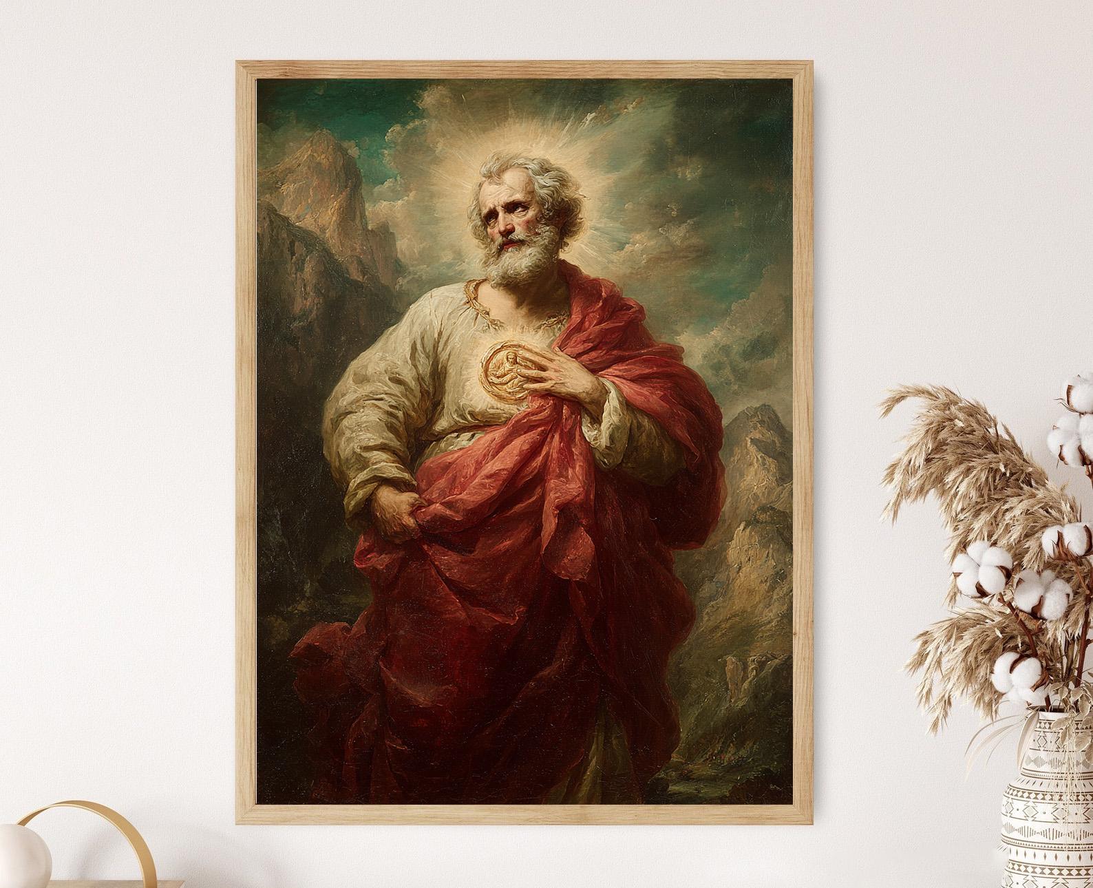 Découvrez cette magnifique affiche représentant Saint Jude l'Apôtre, illuminé par une lumière dorée, avec un arrière-plan montagneux apaisant. Cette illustration émotive évoque la sérénité et la dévotion, idéale pour une décoration murale spirituelle. Ajoutez une touche d'art mural chargée de sens à votre intérieur et laissez cette œuvre inspirante transformer votre espace.