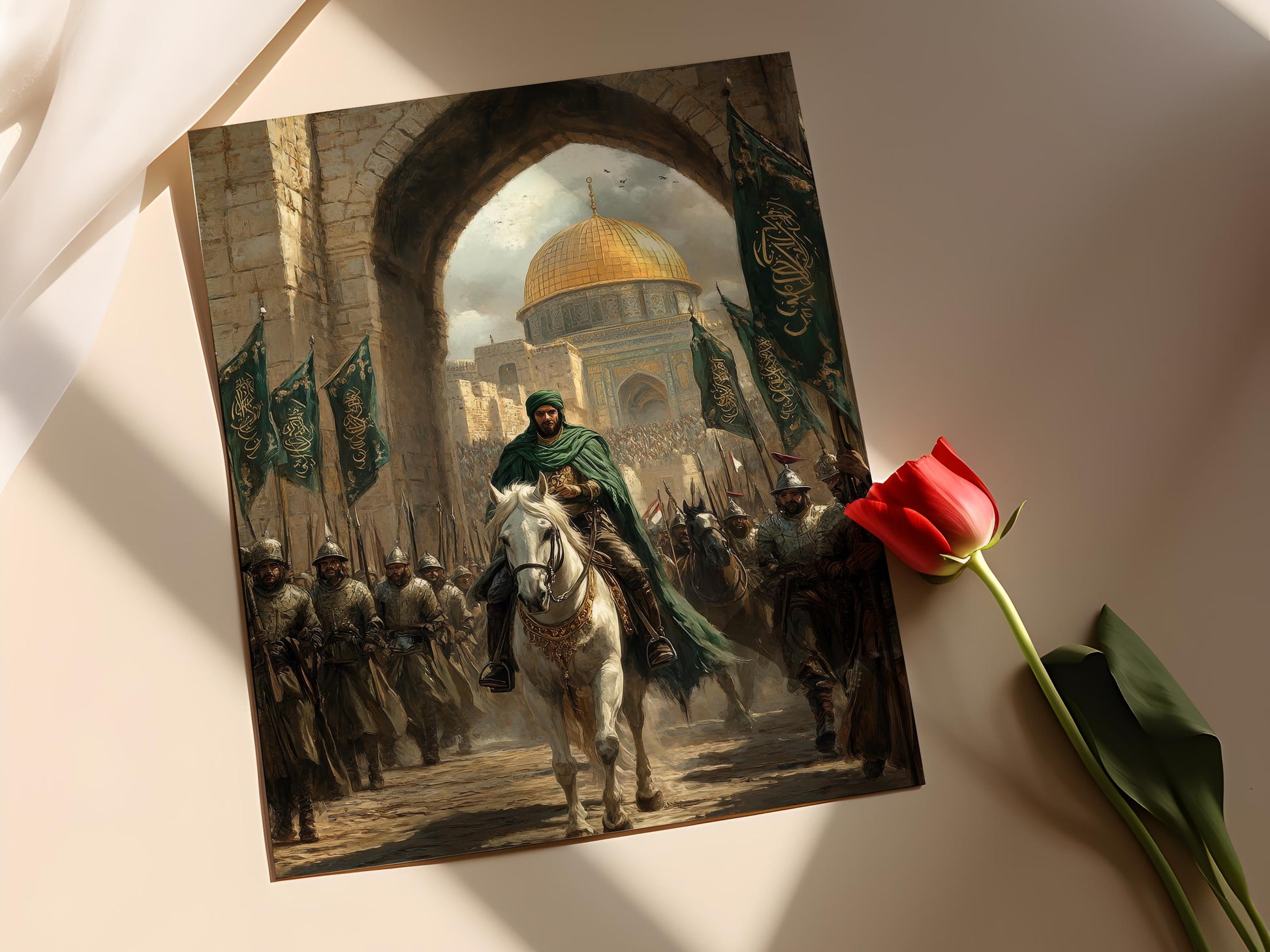 Découvrez cette magnifique affiche qui immortalise l'entrée historique de Salah ad-Din à Jérusalem en 1187. L'illustration vibrante dépeint le chef majestueux sur son cheval blanc, entouré de bannières colorées et de guerriers loyaux, avec le Dôme du Rocher scintillant en arrière-plan. Cette œuvre d'art mural, pleine d'émotion et de grandeur, apportera une touche d'histoire et d'élégance à votre décoration murale.