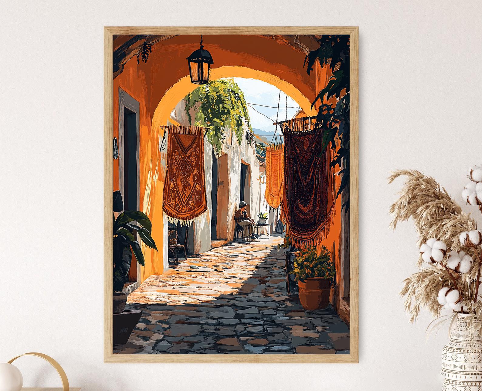 Découvrez cette affiche élégante qui capture la douceur d'un coin de laine à Santa Rosa de Copán, au Honduras. Avec ses fils de laine baignant dans la lumière du soleil et ses wraps brodés, cette illustration évoque une atmosphère chaleureuse et authentique, parfaite pour enrichir votre décoration murale. Ce poster mural artistique, inspiré par l'artisanat local, apporte une touche de sérénité et de tradition à votre art mural.