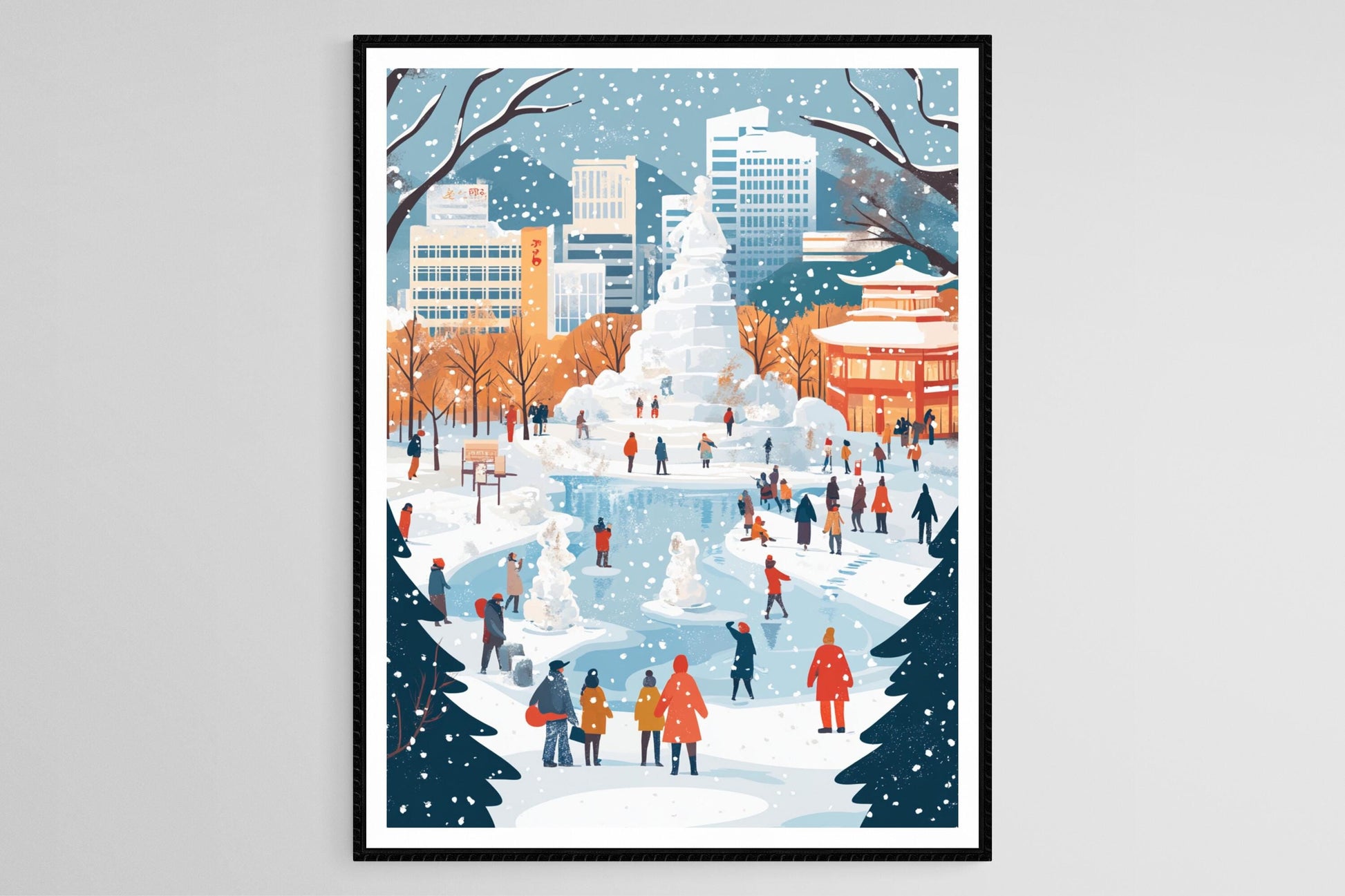 Découvrez cette magnifique affiche qui capture la magie hivernale du parc Odori à Sapporo pendant le Festival de Neige. L'illustration vibrante met en avant des sculptures de neige éblouissantes et des rues scintillantes, évoquant une atmosphère festive et joyeuse. Ce poster mural constitue une décoration murale parfaite pour apporter une touche de culture japonaise et d'émerveillement à votre intérieur.
