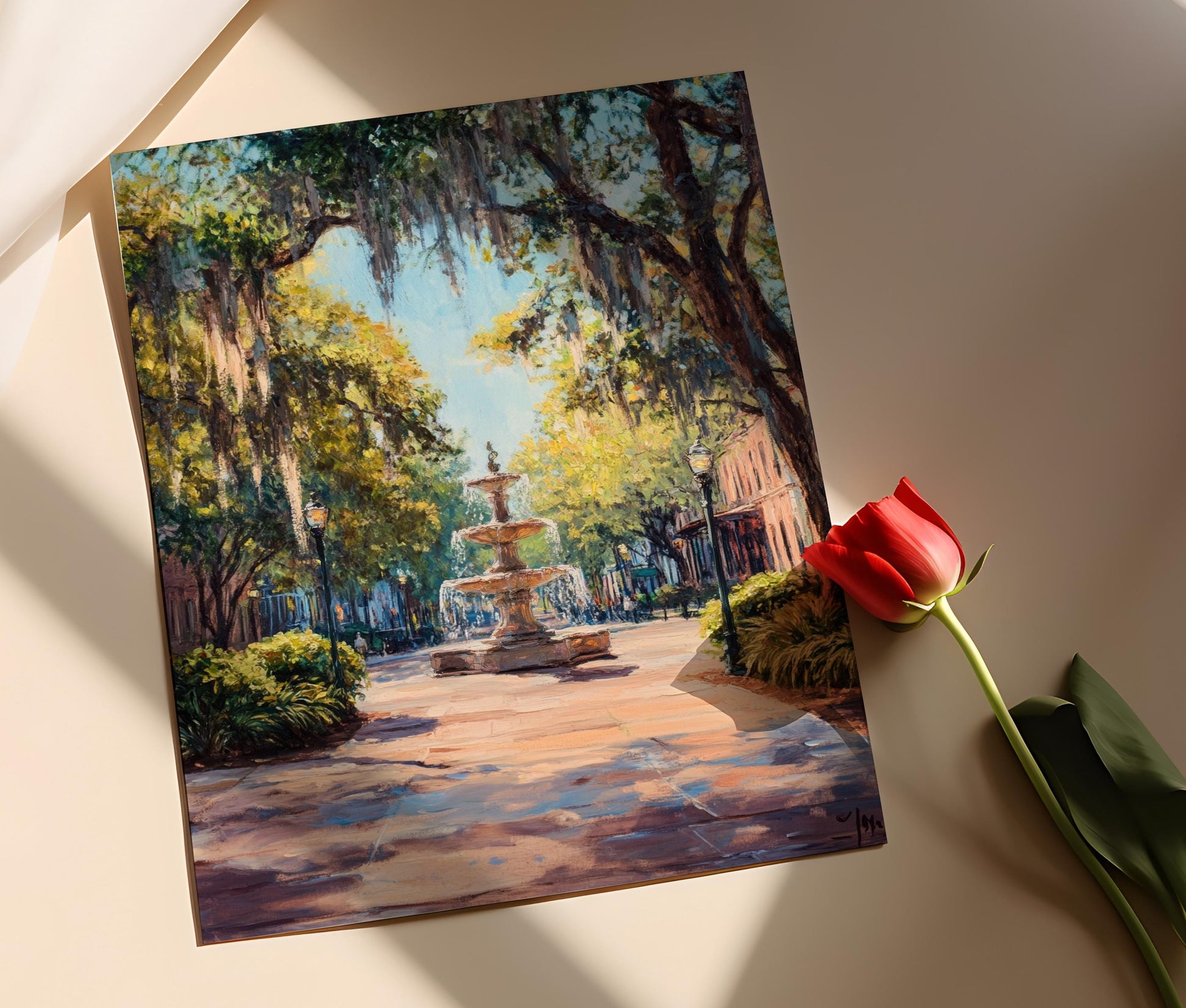 Découvrez cette magnifique affiche qui rend hommage au charme historique de Savannah, en Georgie. Avec une illustration délicate du célèbre Forsyth Fountain, des places pittoresques et des chênes majestueux ornés de mousse espagnole, ce poster mural évoque une atmosphère douce et intemporelle. Parfait pour une décoration murale, cet art mural transporte les amoureux de la nature et de l'architecture dans un voyage au cœur du Sud des États-Unis.