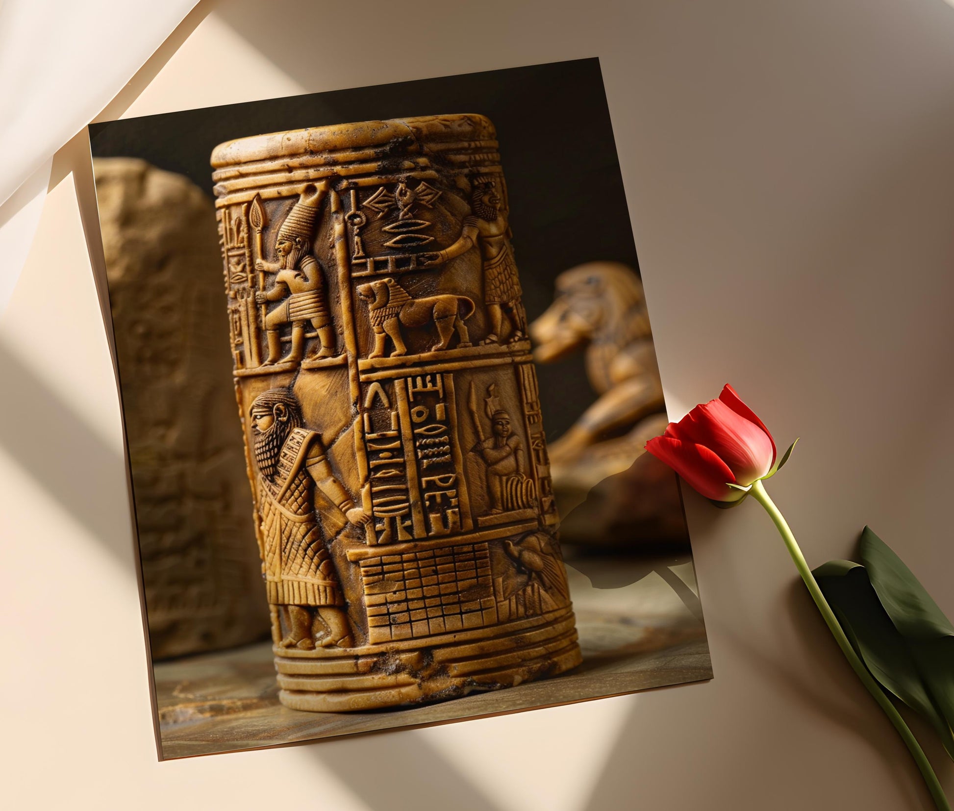 Découvrez notre affiche inspirée des sceaux cylindriques babyloniens, qui évoque l'essence mystique de la Mésopotamie antique. Cette illustration captivante, ornée de gravures complexes et d'écritures cunéiformes, apporte une touche de spiritualité et d'histoire à votre décoration murale. Idéale pour enrichir votre art mural, elle séduira les passionnés d'histoire et les amateurs d'artefacts anciens.