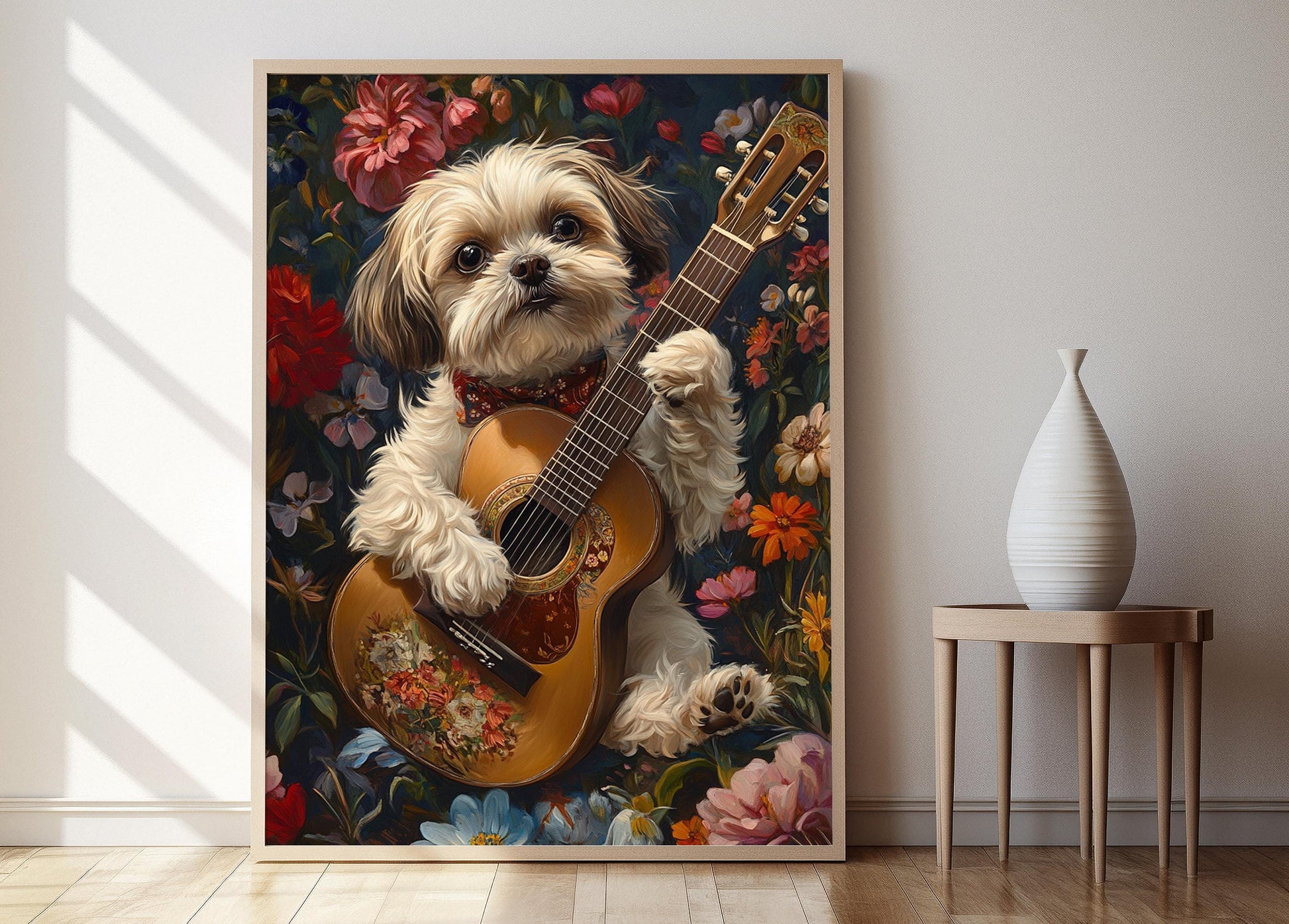 Affiche Shih Tzu Jouant de la Guitare – Poster Animaux Drôles en Édition Fine