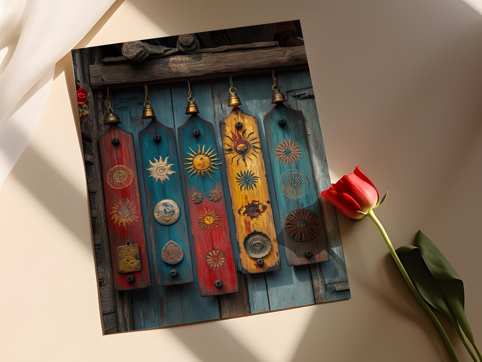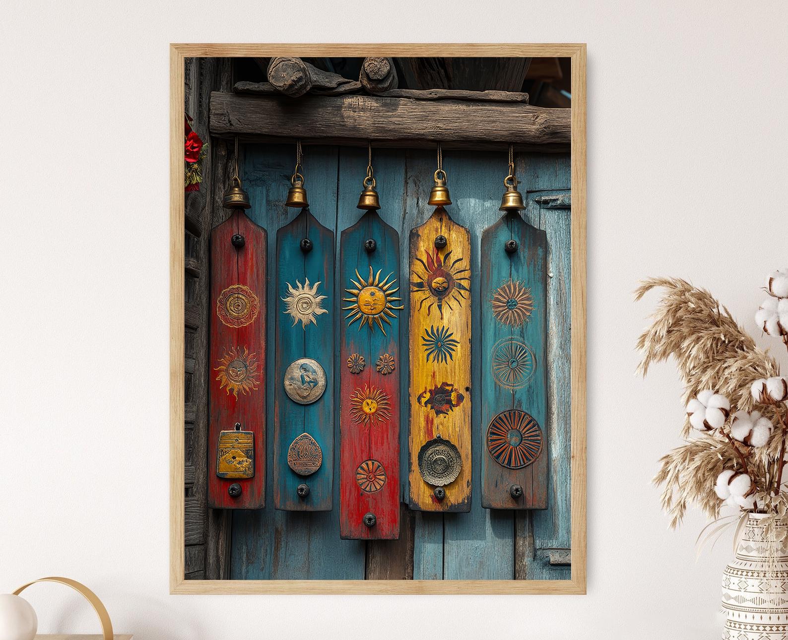 Découvrez cette affiche captivante qui met en valeur des plaques en bois népalaises ornées de motifs solaires et lunaires, sublimées par des couleurs folkloriques éclatantes. Cette décoration murale évoque l'esprit chaleureux de l'Himalaya, tandis que les petites cloches en laiton ajoutent une touche d'authenticité. Une illustration qui transformera votre espace en un véritable havre de paix et de culture.