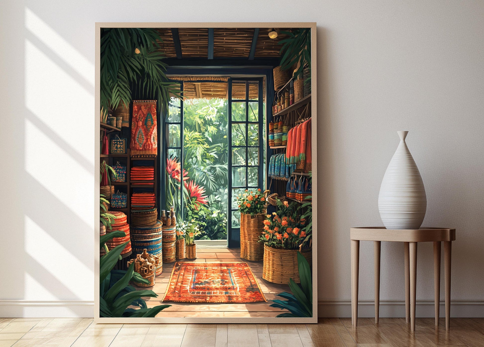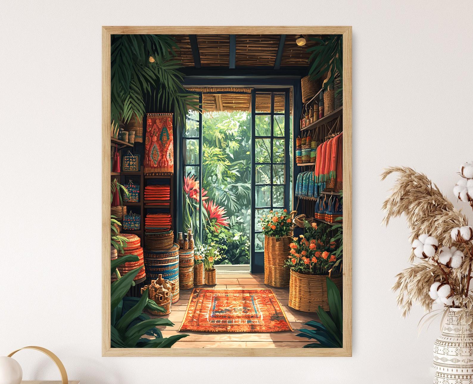Découvrez cette affiche captivante qui plonge dans l'univers coloré d'une boutique de souvenirs assamaise. Avec ses illustrations vibrantes de tissus mekhela chador, de paniers en rotin et d'artisanats en laiton, ce poster mural évoque la richesse des traditions d'Assam. Parfait pour ajouter une touche d'exotisme à votre décoration murale, cet art mural saura éveiller l'émotion et la curiosité dans votre intérieur.
