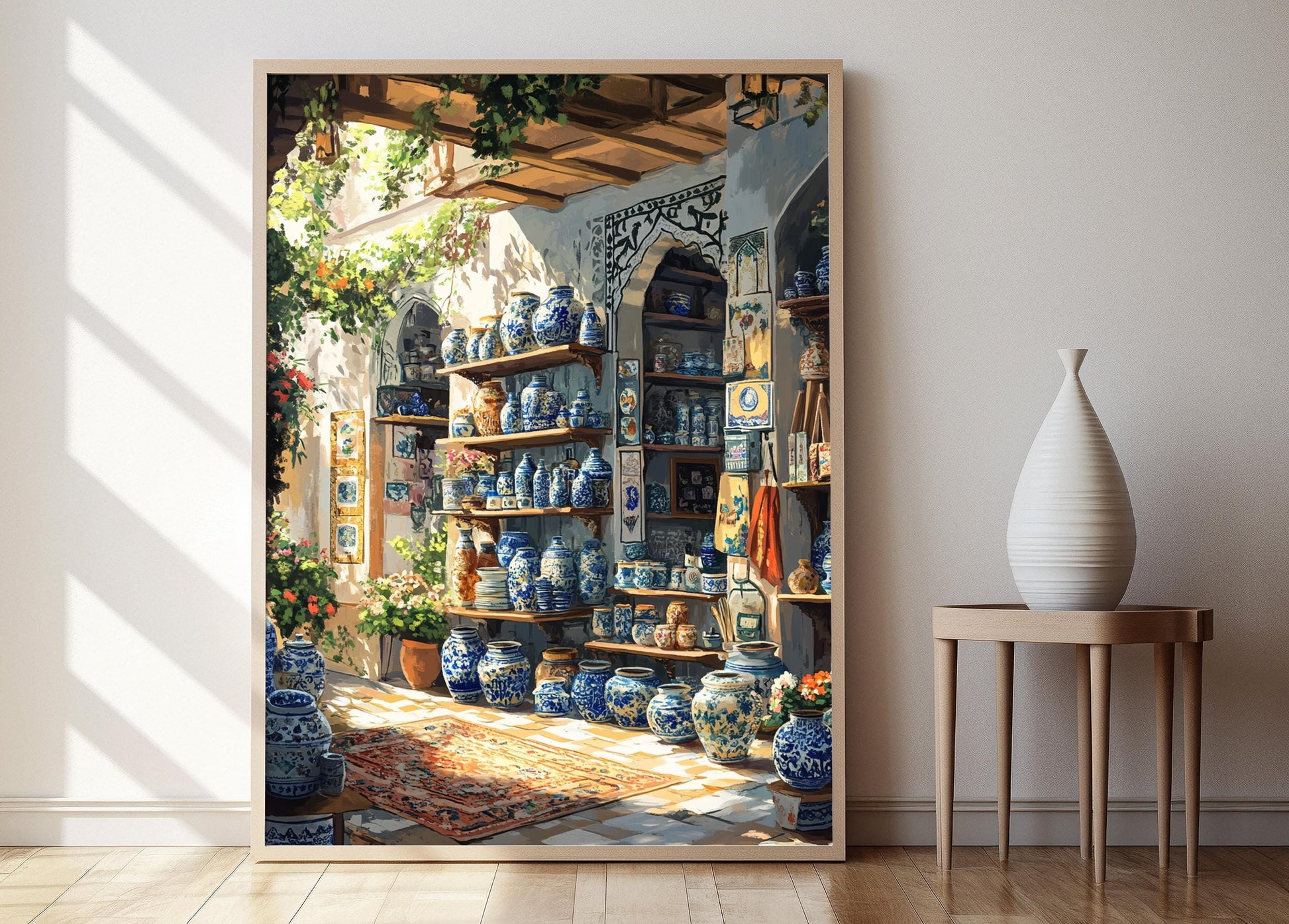 Découvrez cette affiche captivante qui évoque le charme chaleureux d'une boutique de souvenirs de Multan, ornée d'une illustration vibrante de poteries bleues, de tissus brodés et de carreaux colorés. Ce poster mural, véritable pièce de décoration murale, apporte une touche d'authenticité et de culture à votre intérieur, créant une atmosphère accueillante et inspirante. Idéale pour les amateurs d'art mural à la recherche de nouvelles émotions visuelles.