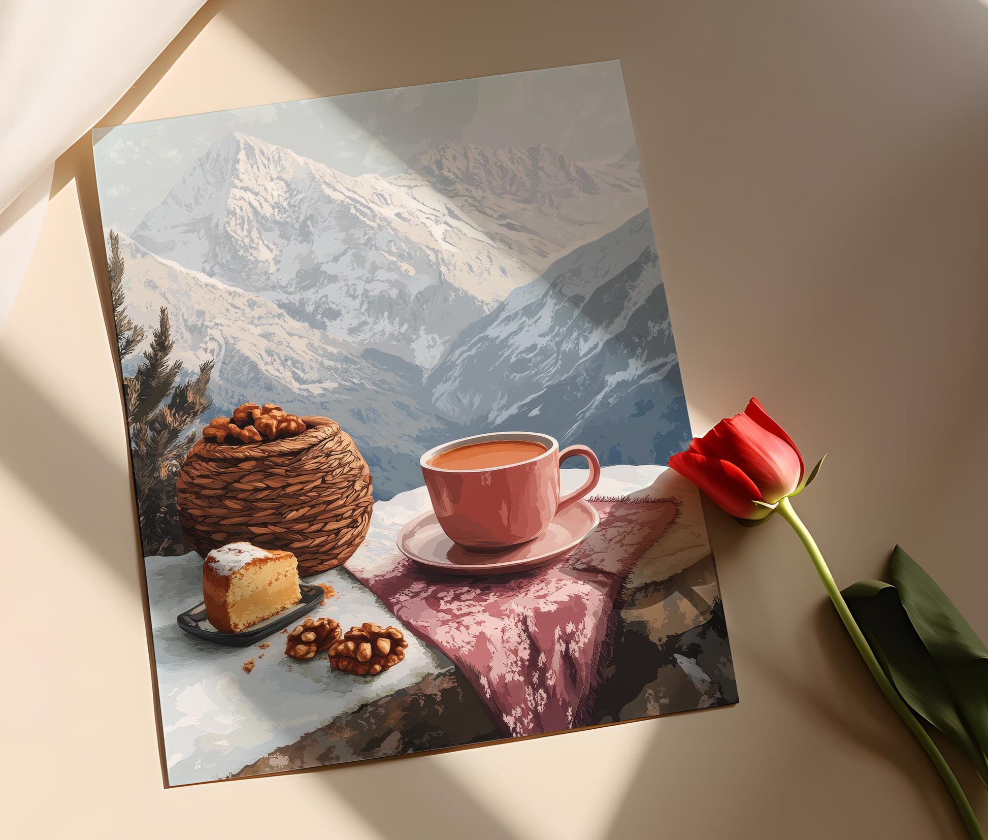 Affiche Srinagar – Poster Matin d'Hiver avec Thé au Beurre et Gâteau aux Noix