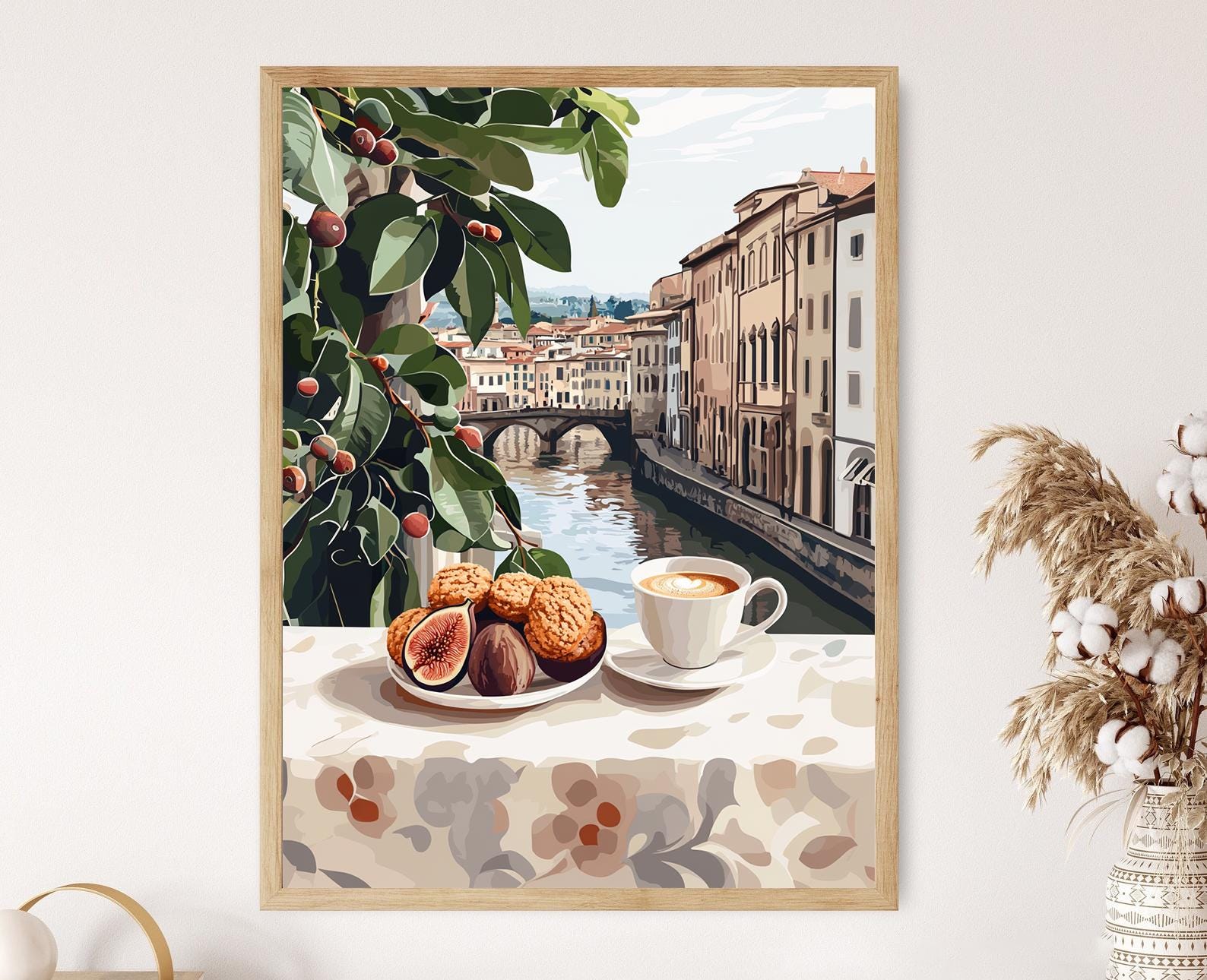Découvrez cette magnifique affiche qui capture l'essence d'un petit-déjeuner chaleureux à Florence. L'illustration délicate met en scène une tasse d'espresso fumante accompagnée de biscuits cantucci croquants et de figues fraîches, le tout sur fond du célèbre Pont Vecchio. Cette œuvre d'art mural évoque une atmosphère de convivialité et d'élégance, parfaite pour élever votre décoration murale.