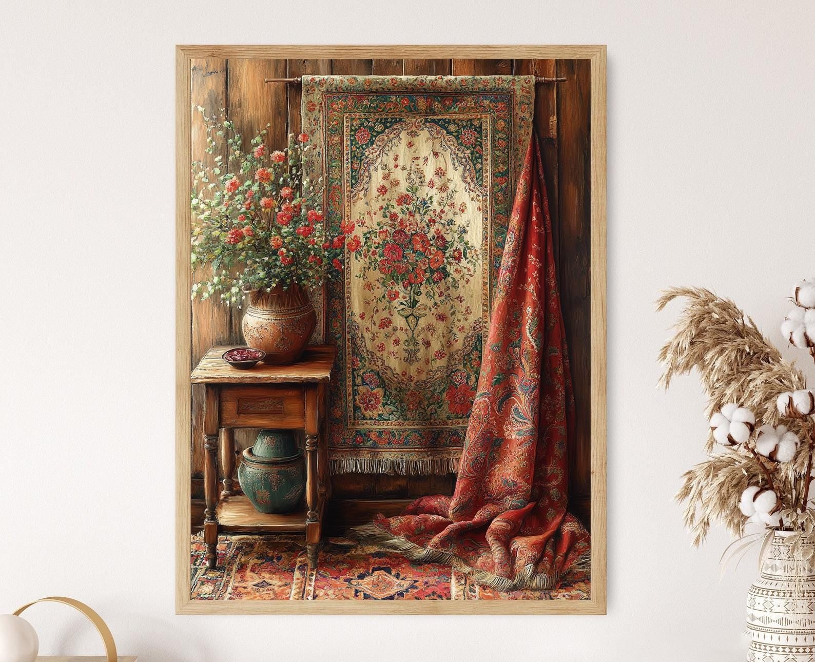 Découvrez cette affiche captivante qui met en valeur une tapisserie kashmirienne, ornée de motifs paisley et d'une broderie délicate. Cette illustration évoque l'élégance et la richesse culturelle du Cachemire, apportant une touche d'art mural unique à votre décoration murale. Idéale pour sublimer vos espaces, ce poster mural invite à la rêverie et à l'évasion.