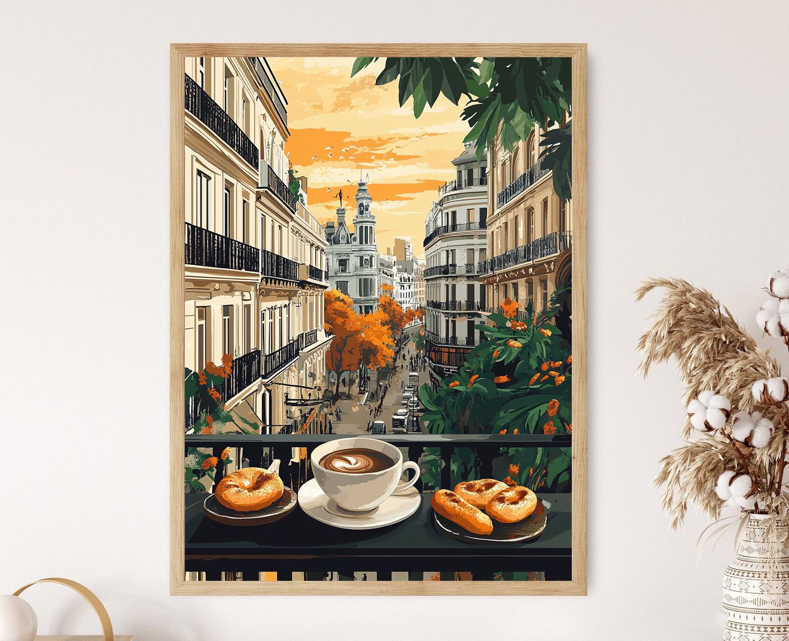 Découvrez cette affiche captivante qui évoque la sérénité d'une tasse de chocolat chaude accompagnée de délicieuses medialunas, le tout baigné dans la lumière dorée du soir. L'illustration met en valeur l'architecture européenne de Buenos Aires et les boulevards verdoyants, créant une atmosphère chaleureuse et nostalgique. Parfaite comme décoration murale, cet art mural apportera une touche de charme argentin à votre intérieur.