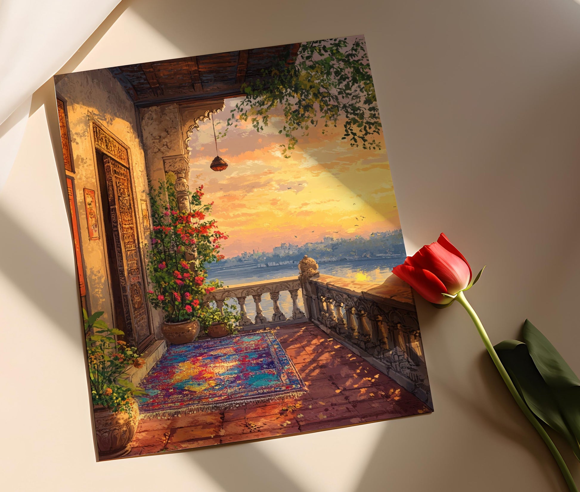 Découvrez cette affiche captivante qui met en valeur une terrasse à Ahmedabad, ornée de textiles bandhej aux couleurs vives et de jalis en pierre sculptée. L'illustration évoque une émotion de sérénité et d'élégance, tout en plongeant le spectateur dans la beauté architecturale du Gujarat, sublimée par un coucher de soleil doré sur le fleuve Sabarmati. Parfaite en tant que décoration murale, ce poster mural apportera une touche d'authenticité et de charme à votre art mural.