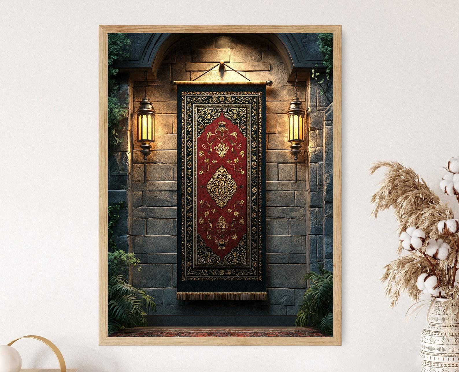 Découvrez cette affiche captivante qui met en avant un textile islamique ornée de calligraphie kufique. Cette illustration riche en détails évoque une atmosphère de sérénité et de sophistication, idéale pour toute décoration murale. Apportez une touche d'art mural inspirée des traditions culturelles à votre intérieur grâce à ce poster mural unique.