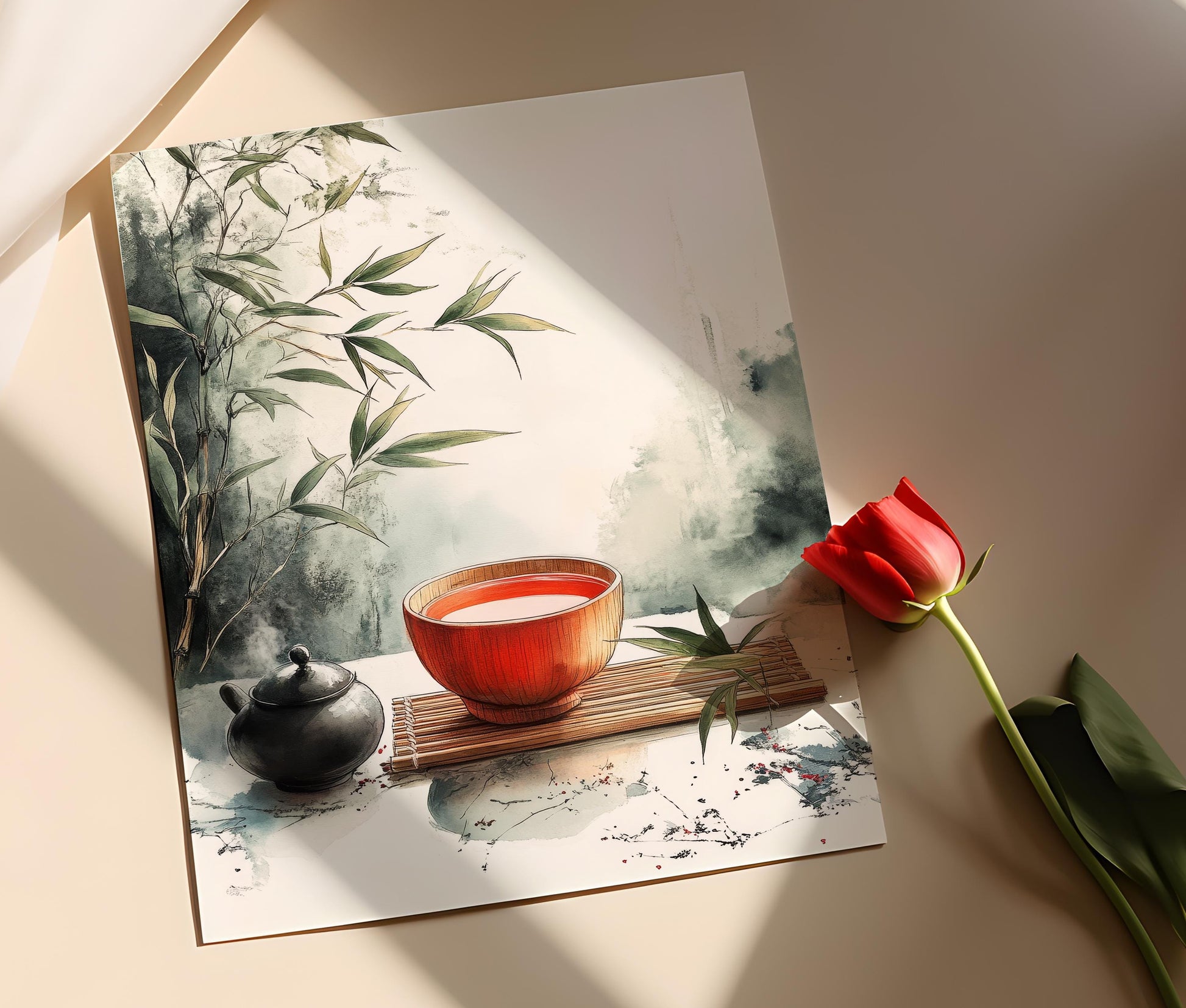 Découvrez notre magnifique affiche inspirée de l'art traditionnel chinois, mettant en scène un dragon majestueux en harmonie avec la délicatesse du thé Longjing servi dans une élégante tasse en bambou. Cette illustration captivante, entourée de feuilles de thé fraîches et de motifs de pinceau à l'encre, évoque une ambiance zen et apaisante, idéale pour votre décoration murale. Ajoutez une touche d'authenticité à votre intérieur avec ce poster mural qui célèbre la richesse de la culture chinoise.