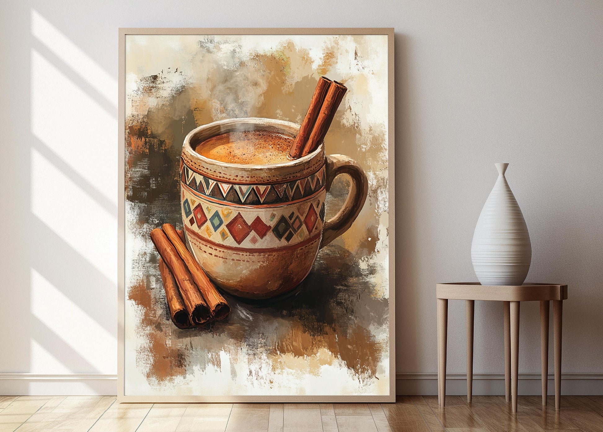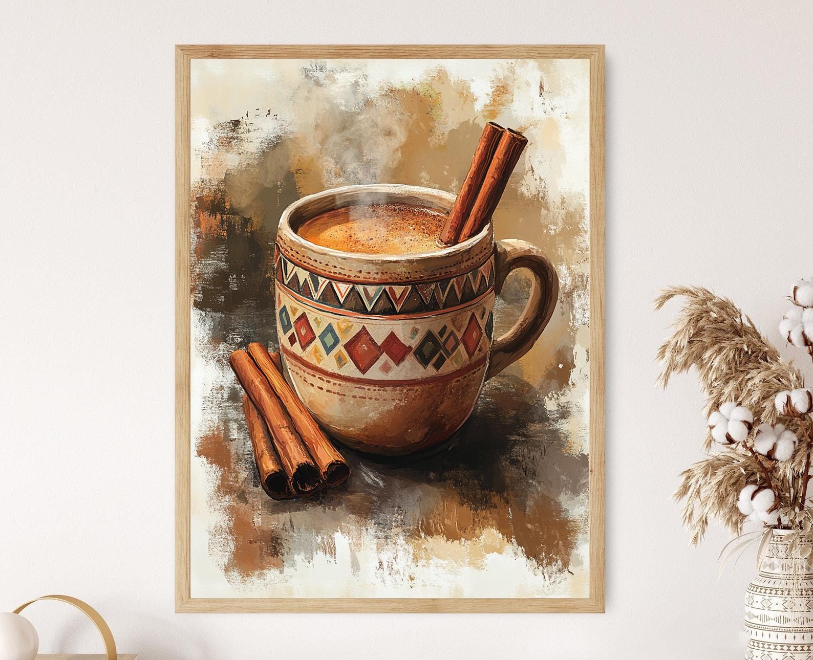 Découvrez cette affiche inspirante qui capture l'essence chaleureuse du thé épicé sri lankais. Avec une illustration d'une tasse en argile ornée de motifs géométriques et accompagnée de bâtons de cannelle, ce poster mural évoque une ambiance rustique et culturelle. Parfait pour enrichir votre décoration murale, cet art mural apportera une touche de convivialité et d'évasion à votre intérieur.