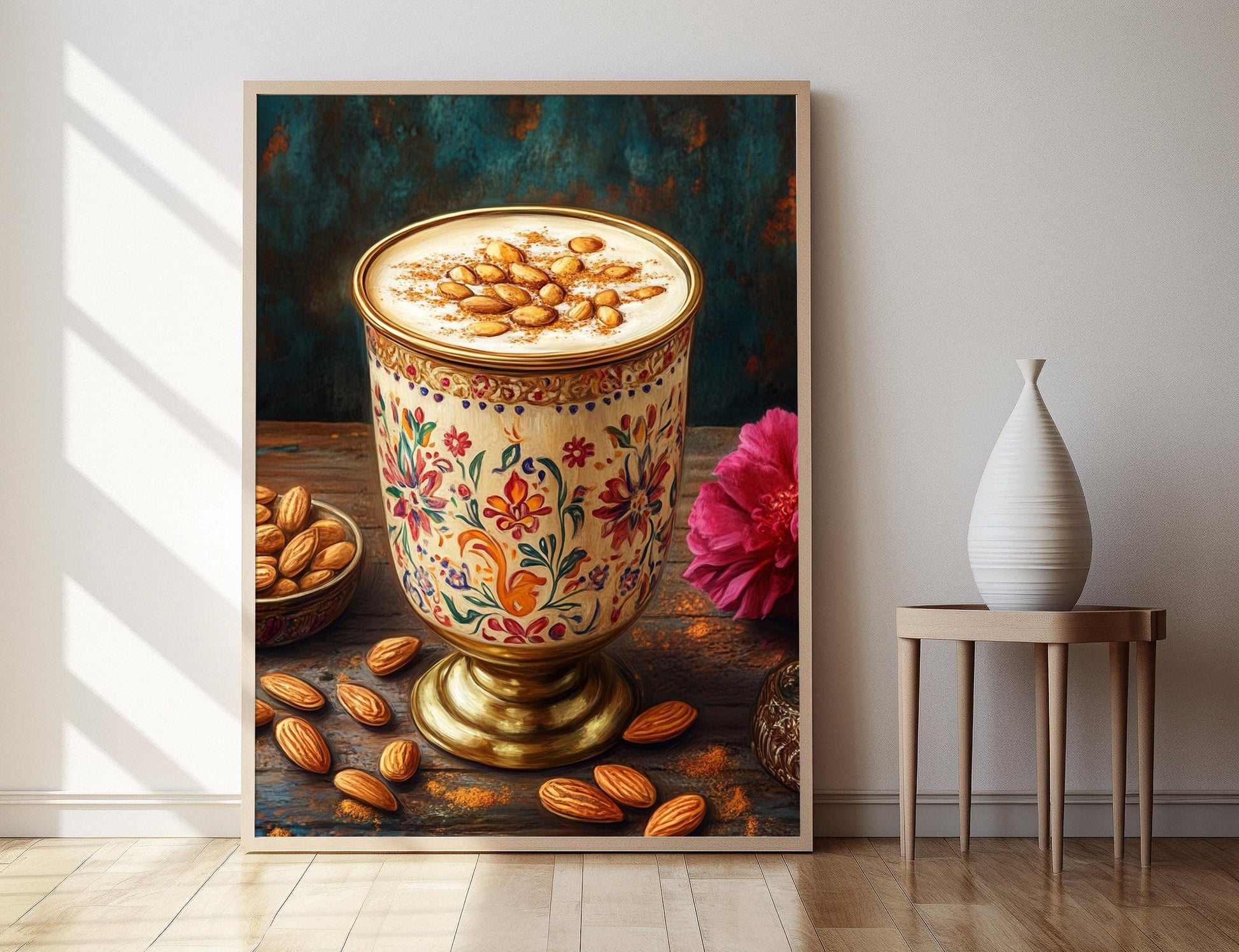 Découvrez cette affiche vibrante illustrant un verre en laiton rempli de thandai traditionnel, ornée de motifs colorés de Rangoli et garnie d'amandes et de brins de safran. Cette décoration murale évoque la richesse de la culture indienne, apportant une touche de chaleur et d'authenticité à votre intérieur. Parfaite pour intégrer un art mural dynamique et festif dans votre espace, cette illustration saura émerveiller et inspirer à chaque regard.