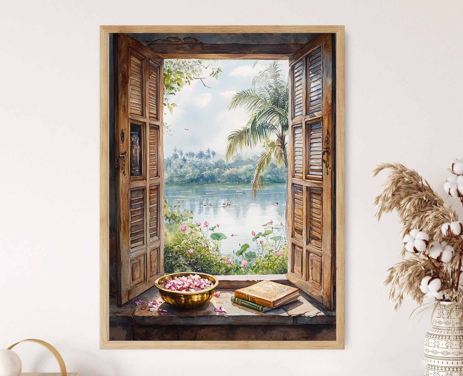 Découvrez cette affiche apaisante illustrant une fenêtre ouverte sur un lac parsemé de lotus à Thane, Maharashtra. Avec des tons doux d'aquarelle, cette décoration murale évoque la sérénité et la beauté du patrimoine local, tandis qu'un urli en laiton, un livre marathi et une tasse de chai ajoutent une touche de charme régional. Ce poster mural est une pièce d'art mural qui apportera une atmosphère élégante et chaleureuse à votre intérieur.