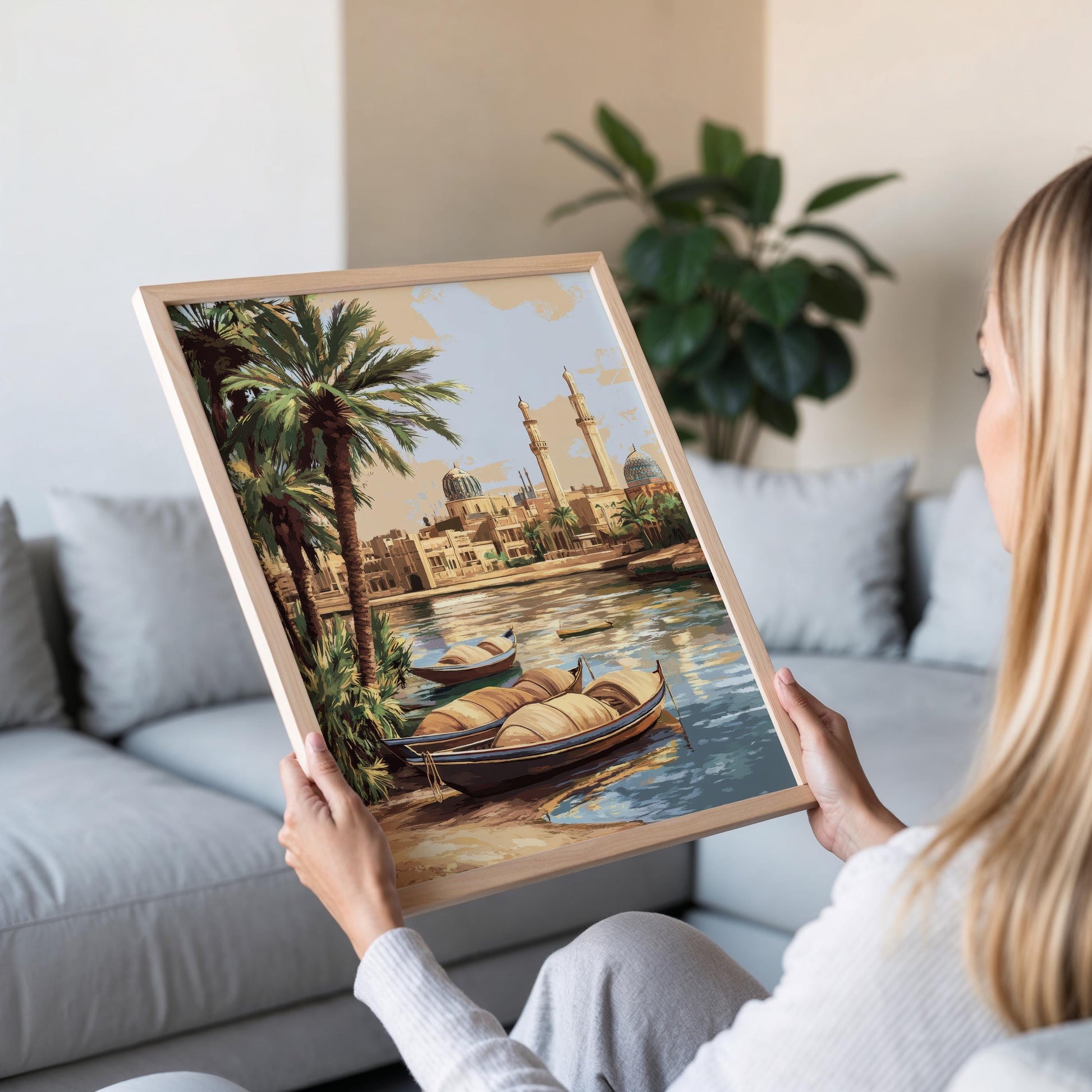 Plongez dans la beauté apaisante de cette affiche inspirante, représentant le fleuve Tigre serpentant à travers Bagdad. Cette illustration, riche en détails, évoque une atmosphère de sérénité avec ses bateaux traditionnels et sa verdoyante berge, faisant de ce poster mural une pièce maîtresse idéale pour toute décoration murale. Laissez-vous transporter par l'élégance de l'art mural qui célèbre les paysages enchanteurs du Moyen-Orient et la culture irakienne.