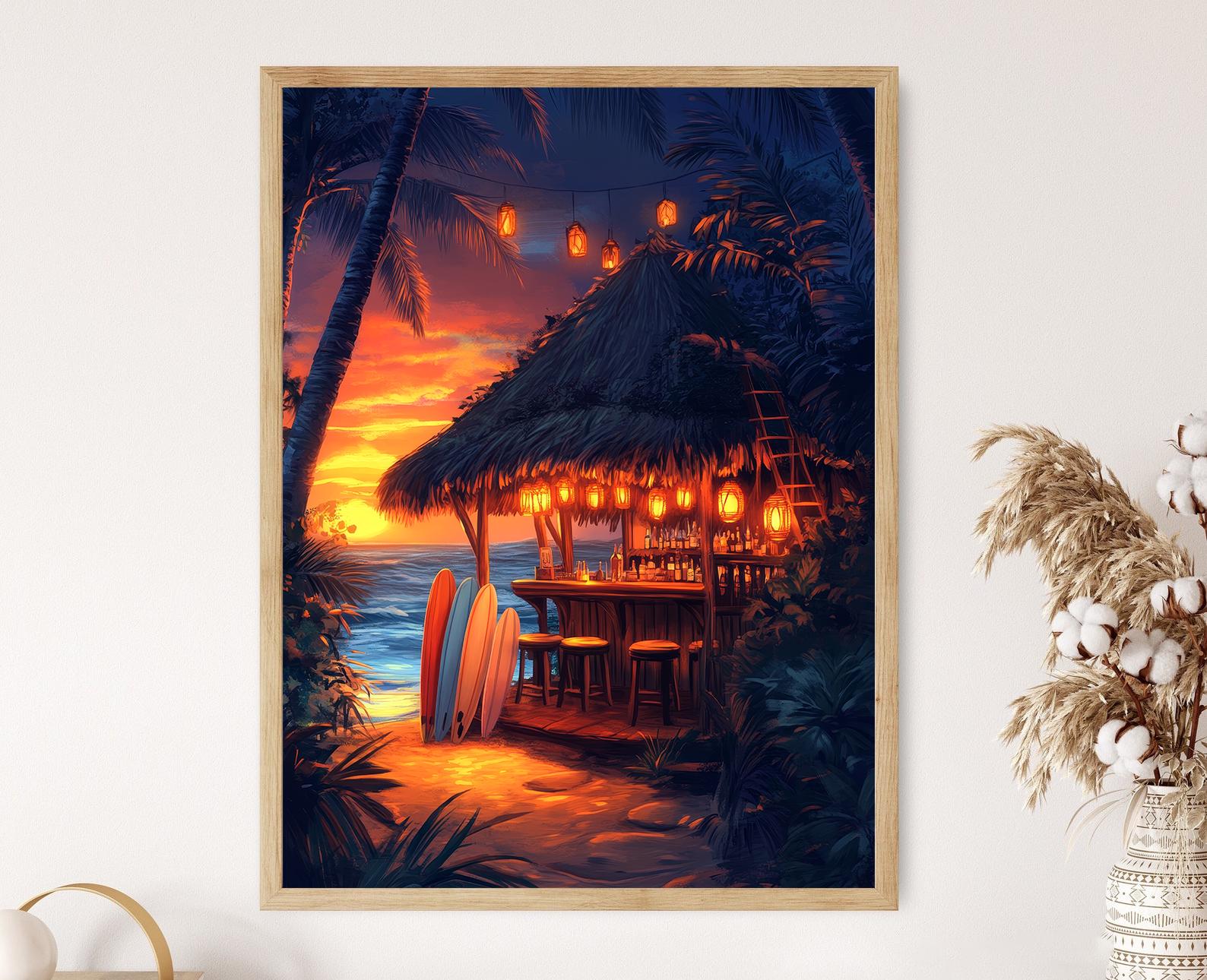 Découvrez notre affiche captivante qui évoque l'ambiance chaleureuse d'un bar tiki hawaïen au coucher du soleil. Avec ses lanternes lumineuses et son toit en chaume, cette illustration crée une atmosphère de détente et d'évasion, parfaite pour votre décoration murale. Transformez votre espace en un havre tropical grâce à cet art mural enchanteur qui invite à rêver.