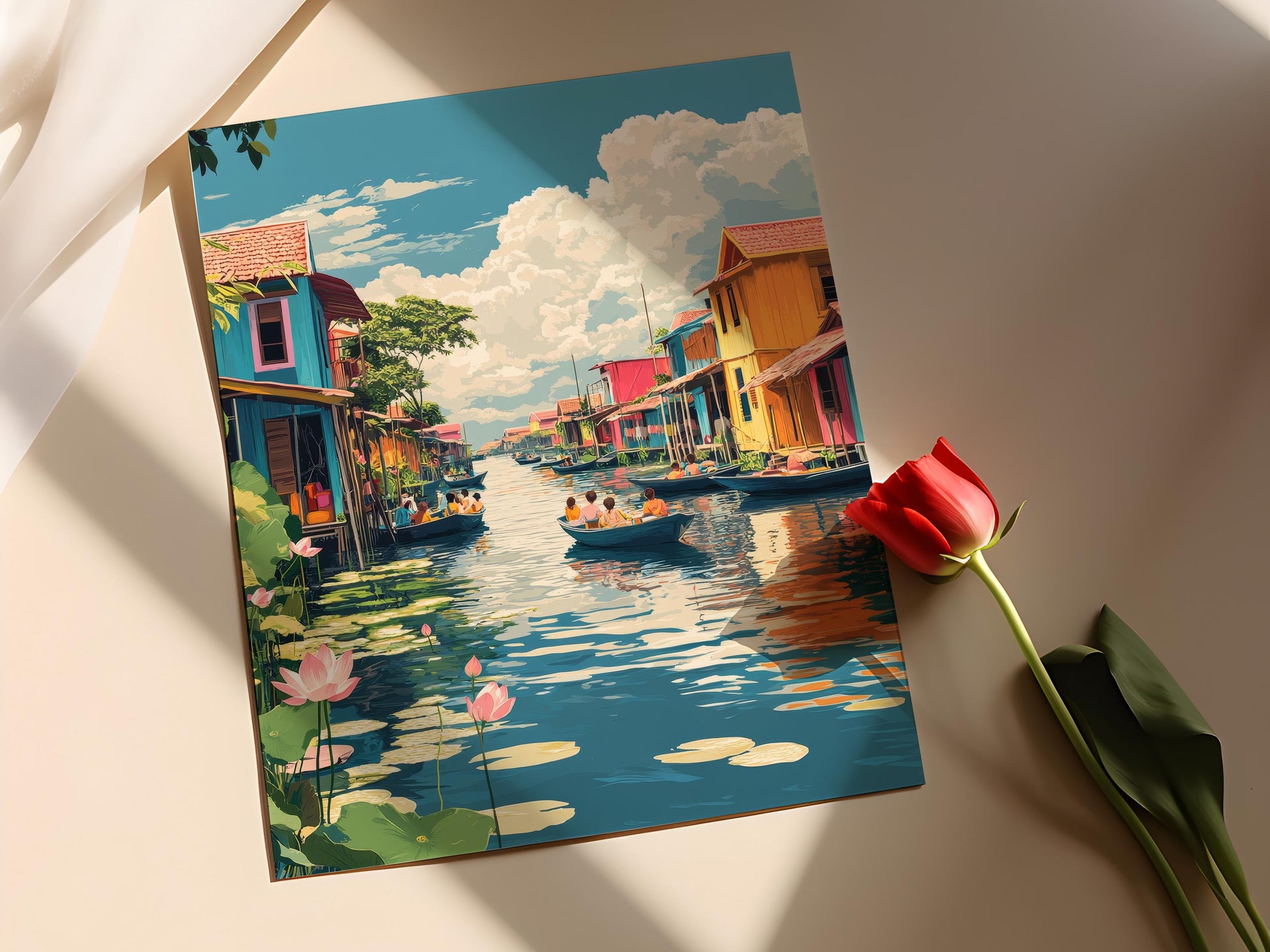 Découvrez notre affiche captivante qui illustre la vie colorée sur le lac Tonlé Sap au Cambodge. Ce poster mural met en avant des maisons flottantes pastel entourées de fleurs de lotus, évoquant une ambiance joyeuse et culturelle. Idéale pour une décoration murale inspirante, cette illustration apportera une touche de sérénité et de voyage à votre espace.