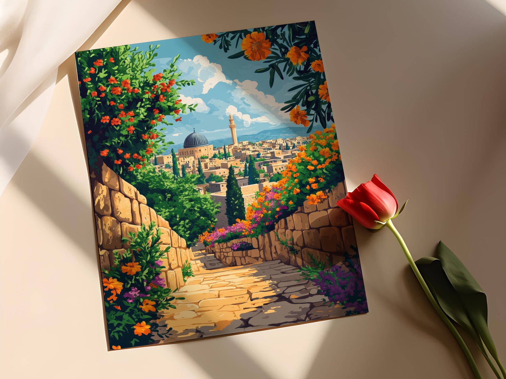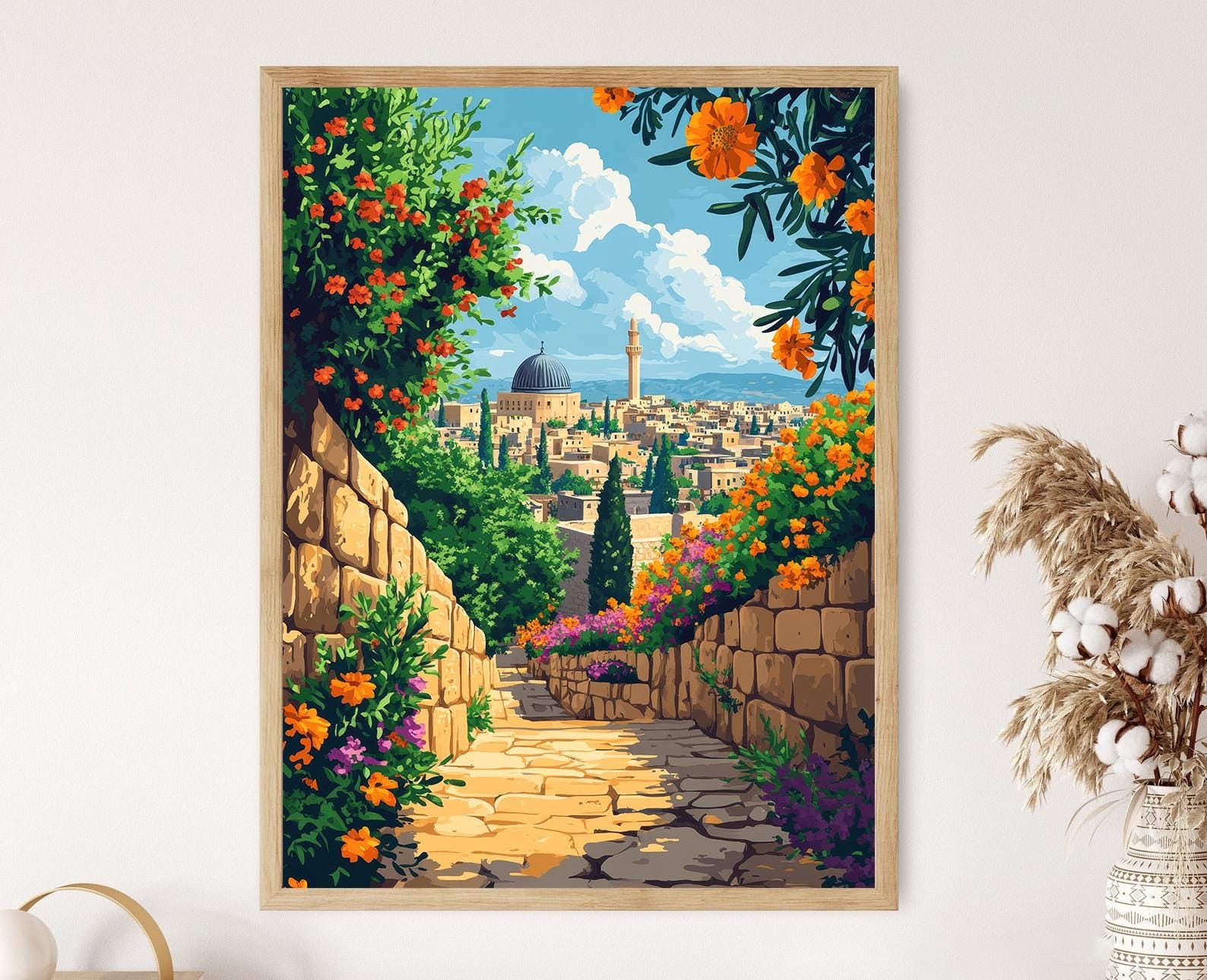 Découvrez cette magnifique affiche qui capture l'essence d'une cour traditionnelle palestinienne à Tulkarm. Avec ses murs en pierre, ses fleurs éclatantes et ses oliviers majestueux, cette illustration évoque une atmosphère sereine et authentique. Parfaite pour votre décoration murale, ce poster mural apporte une touche d'art mural culturel et inspirant à votre intérieur.
