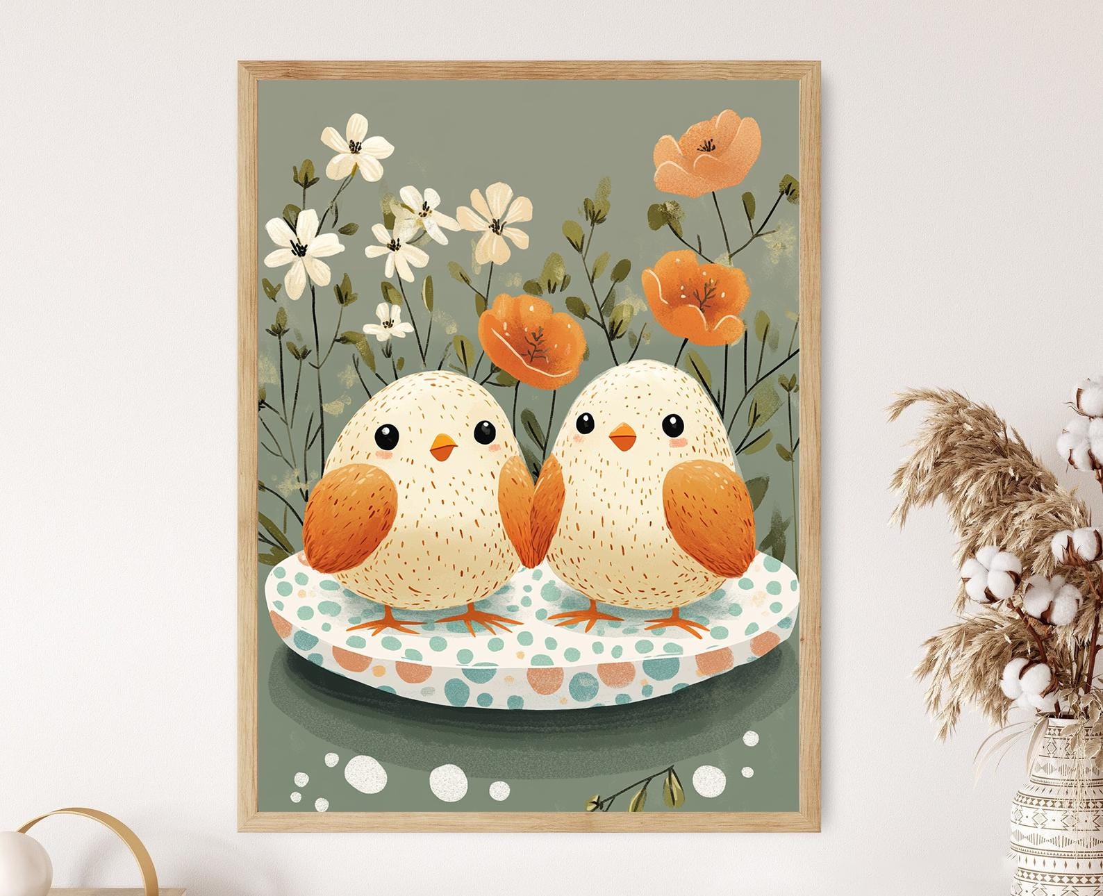 Découvrez cette affiche ludique qui transforme des œufs mimosa en adorables petits poussins, agrémentés de simples accents végétaux. Avec son style pastel et ses fleurs délicates, ce poster mural apporte une touche joyeuse et printanière à votre décoration murale, idéale pour égayer votre cuisine ou célébrer les brunchs de Pâques. Cette illustration charmante incarne la légèreté et la gaieté, faisant de cet art mural un véritable coup de cœur.