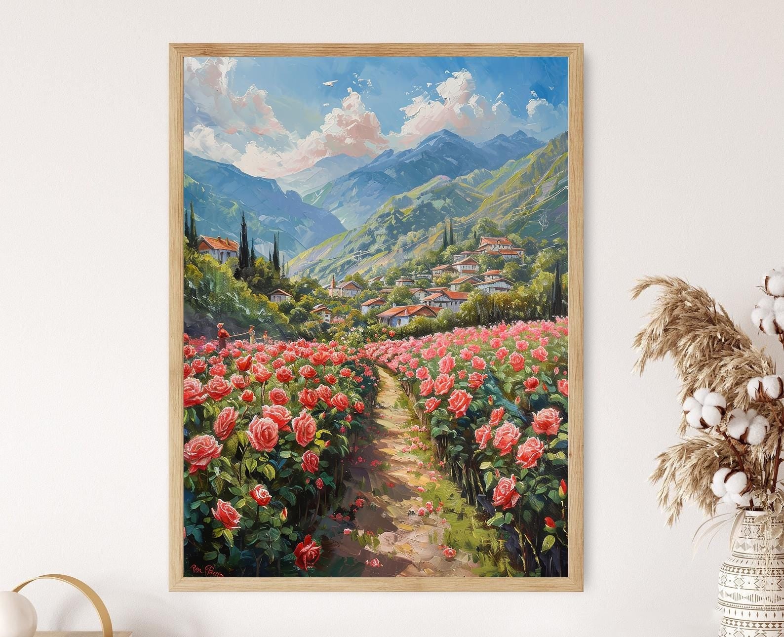 Découvrez l'affiche Vallée de Roses Bulgare, une illustration captivante qui évoque la douceur et la beauté des paysages floraux. Ce poster mural, riche en couleurs vibrantes, transmet une atmosphère poétique et romantique, idéale pour embellir votre décoration murale. Plongez dans l'univers enchanteur de l'art mural inspiré par la nature et laissez-vous séduire par l'élégance des cueilleurs de roses.