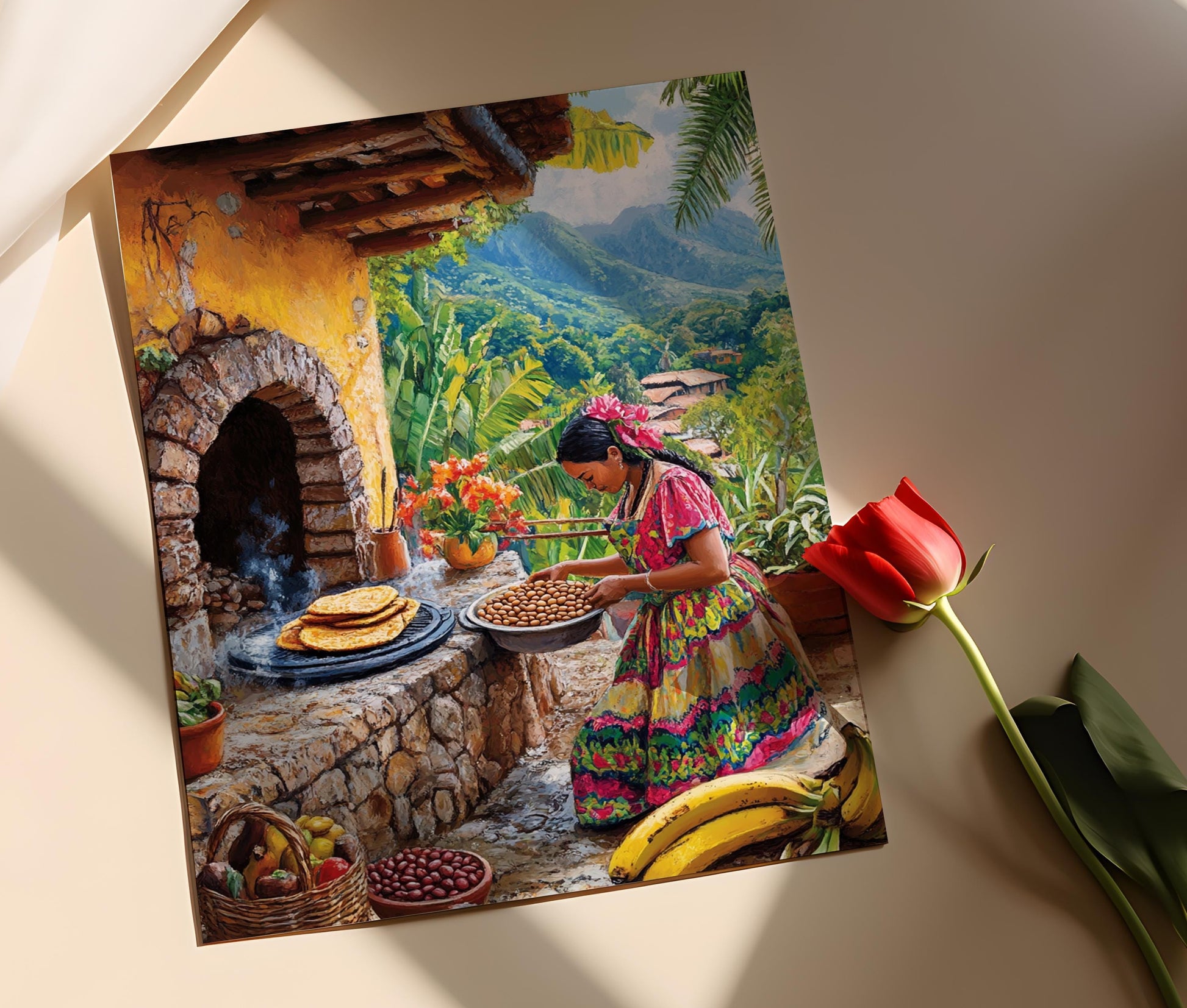 Découvrez cette magnifique affiche qui capture l'essence vibrante d'une femme hondurienne en pleine préparation de baleadas sur un four en pierre. L'illustration colorée dépeint un village tropical animé, où les haricots frais, les avocats et les plantains ajoutent une touche de vie à la scène. Ce poster mural est une véritable célébration de la culture et une décoration murale éclatante qui apportera chaleur et émotion à votre art mural.