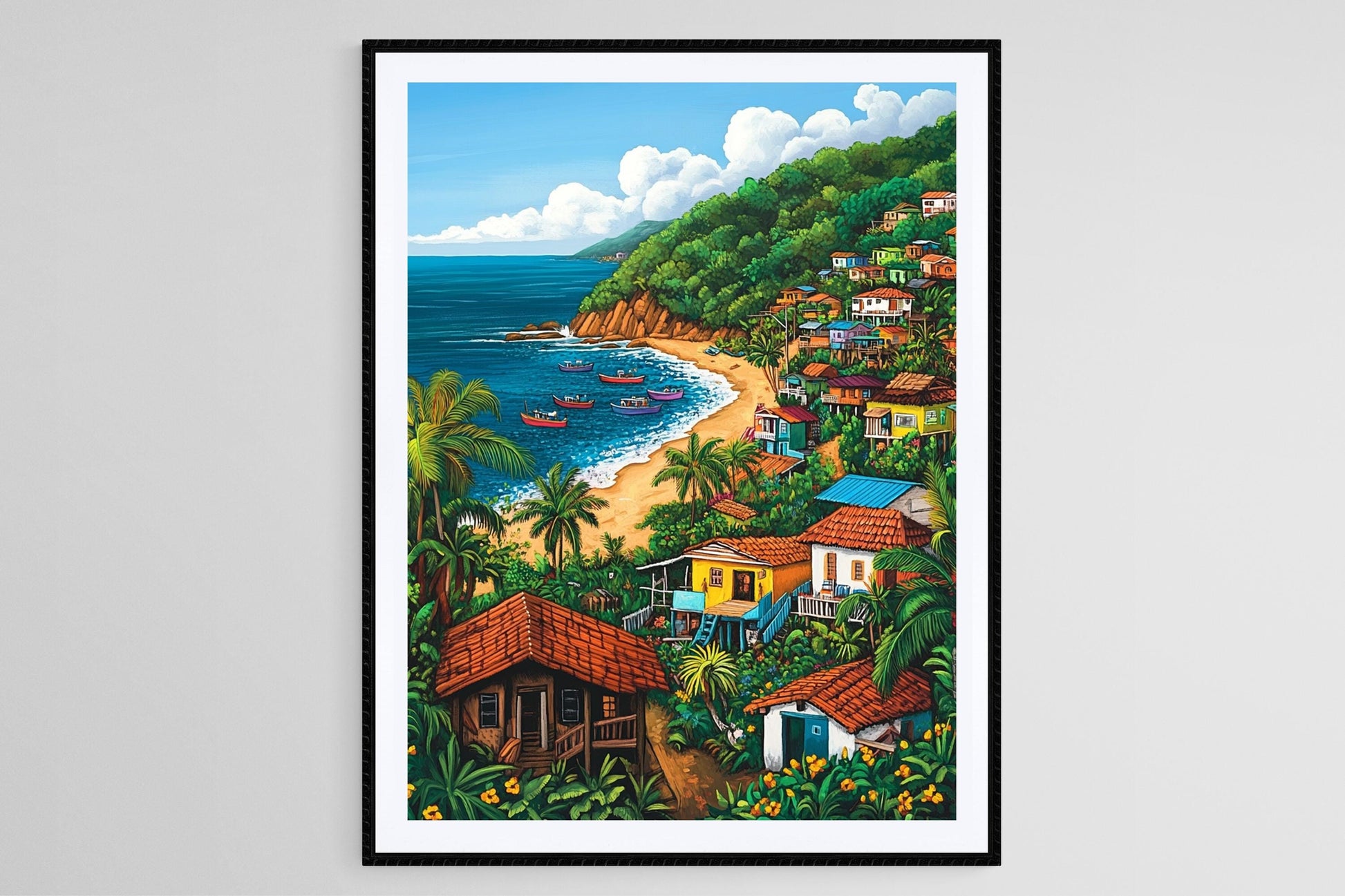 Découvrez cette affiche captivante qui illustre la beauté vibrante d'un village traditionnel sur la côte du Honduras. Avec ses couleurs éclatantes et son style détaillé, ce poster mural évoque la chaleur de la culture hondurienne et invite à la sérénité maritime. Parfait pour enrichir votre décoration murale, cette illustration apporte une touche d'authenticité et d'émotion à votre art mural.