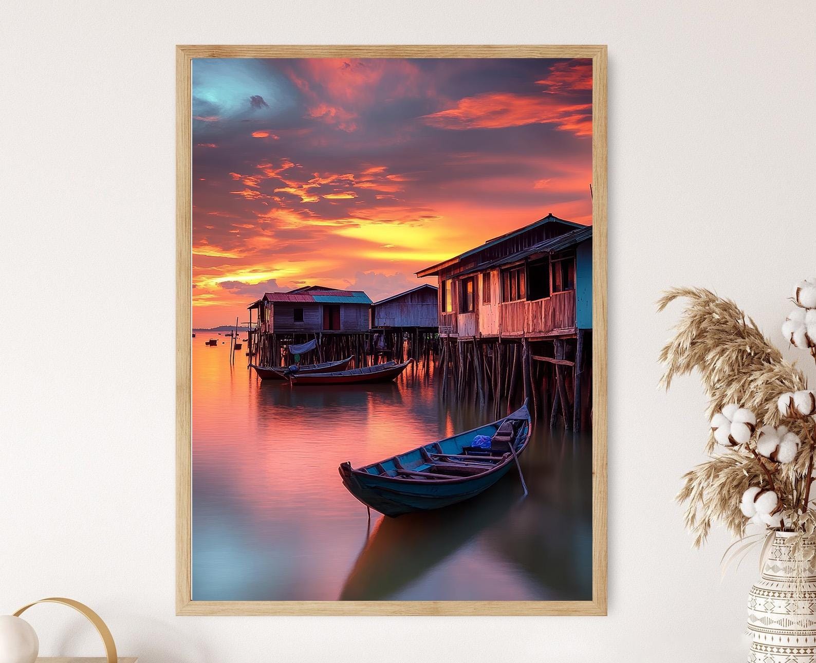 Affiche Village Côtier Malais – Impression d'Art, Bateaux Traditionnels, Coucher de Soleil